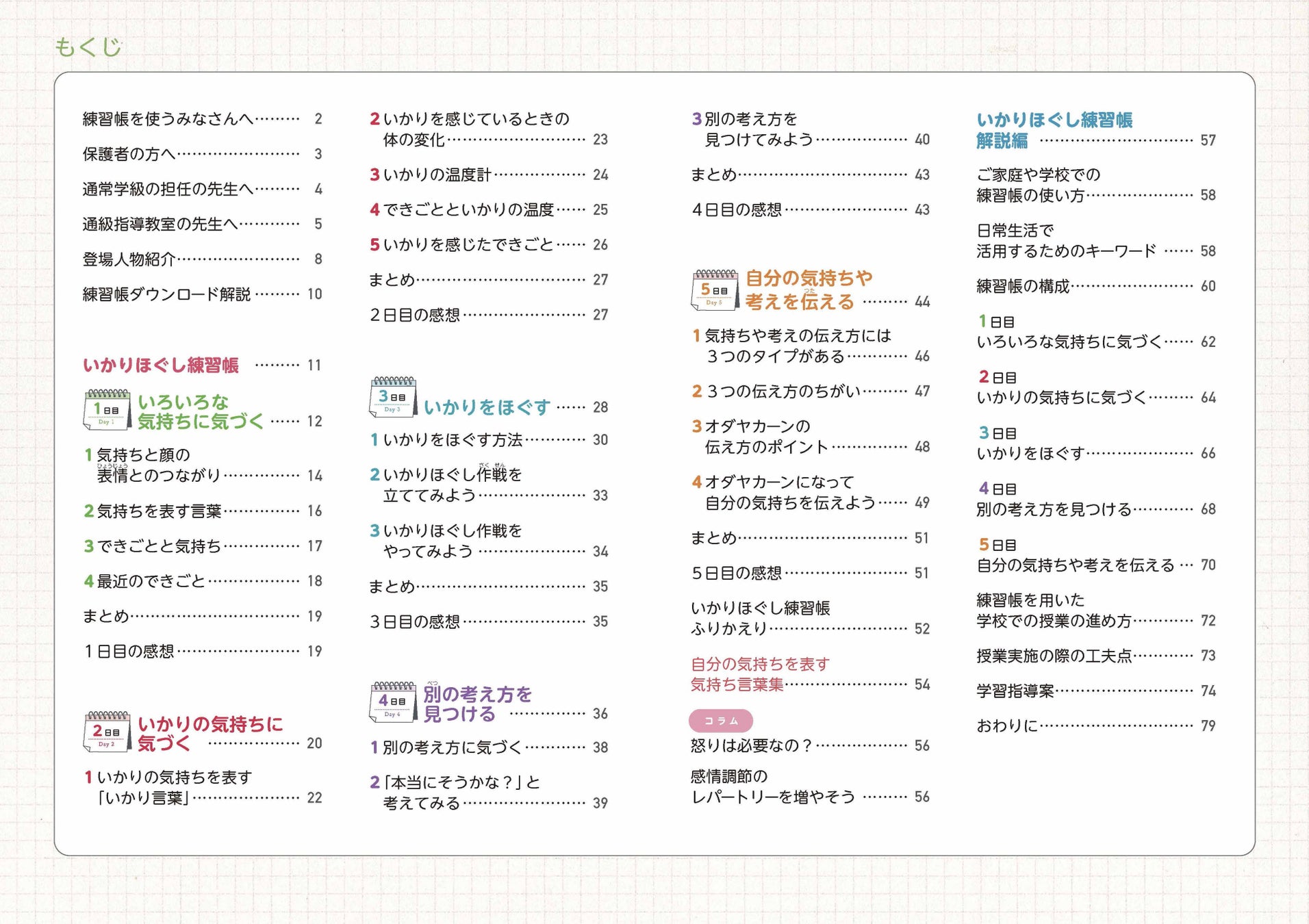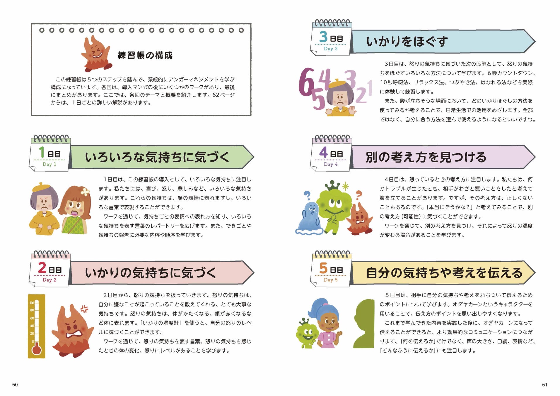 構成は、マンガとイラストが満載かつ5日間で1日ごとにテーマを分けて取り組める「練