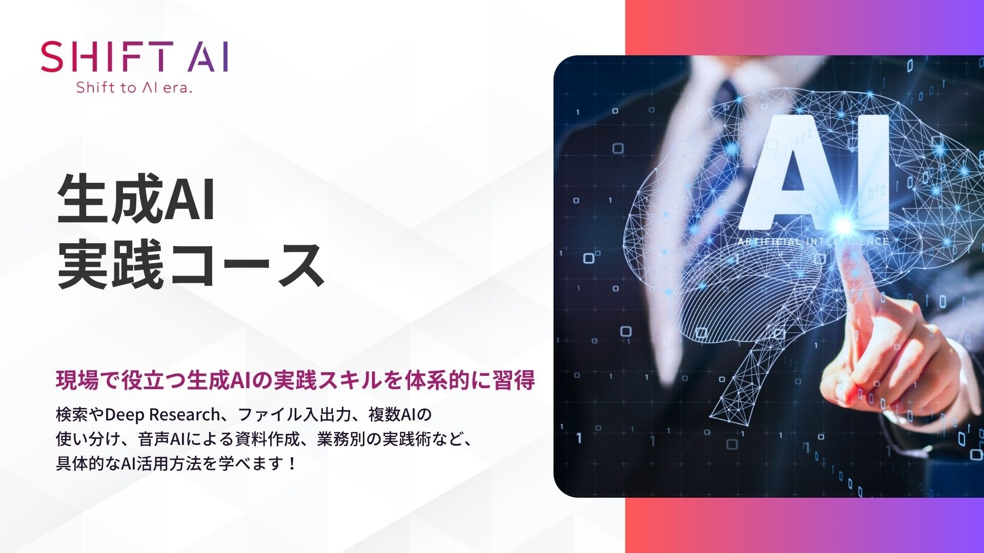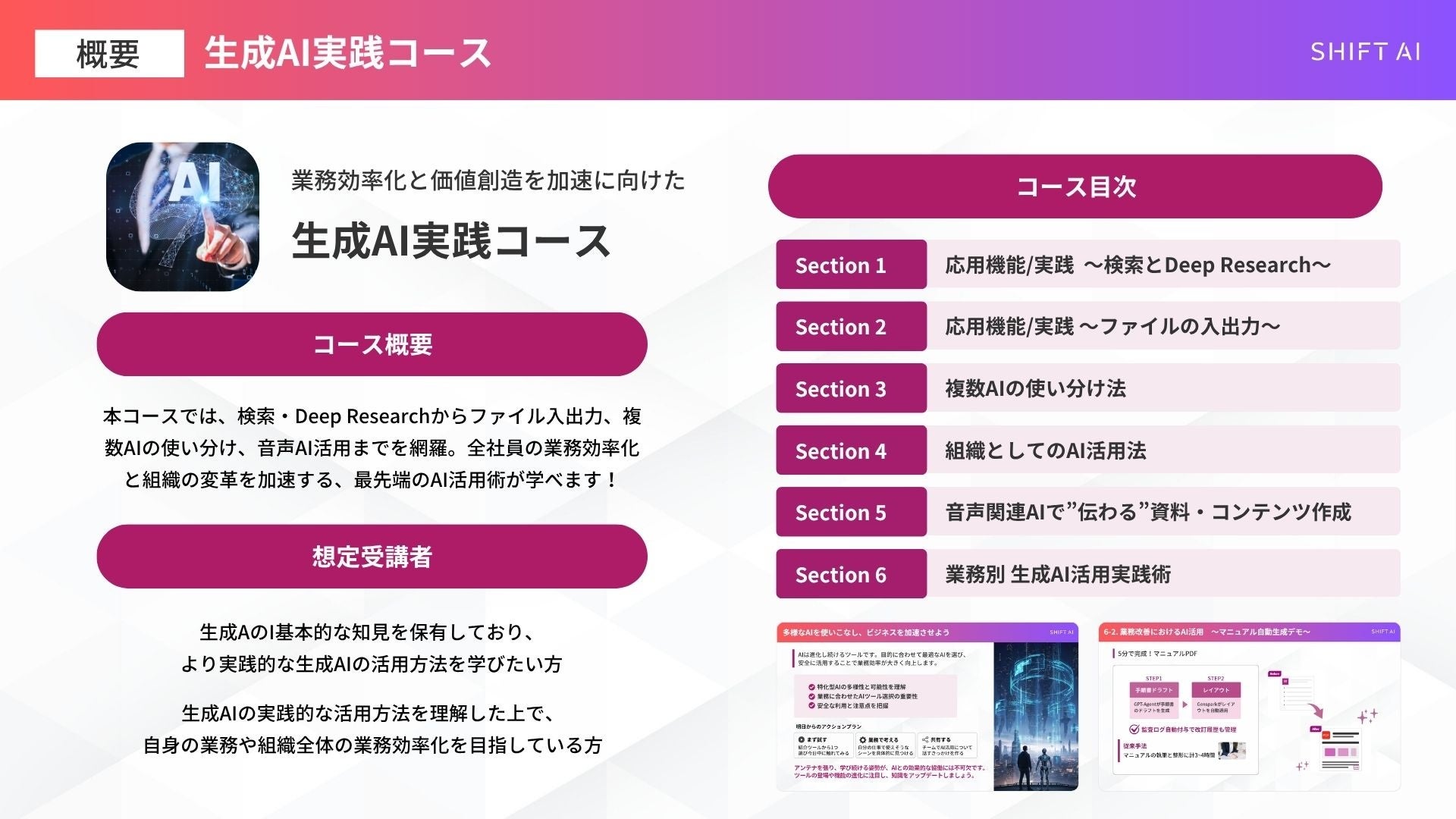 「日本をAI先進国に」を掲げAIのビジネス活用を学べる利用者数No.1※のAI大学「SHIFT AI」を運営する株式会社SHIFT AI(東京都渋谷区、代表取締役 木内翔大、以下 当社 )は、法人向け新サービス「生成AI実践コース」を2025年7月9日より提供開始します。本コースは「生成AI基礎コース」を学習済みの方に推奨される実践的な内容が特徴です。以下のセクションで構成されており、各分野における生成AIの具体的な活用方法を深く掘り下げます。