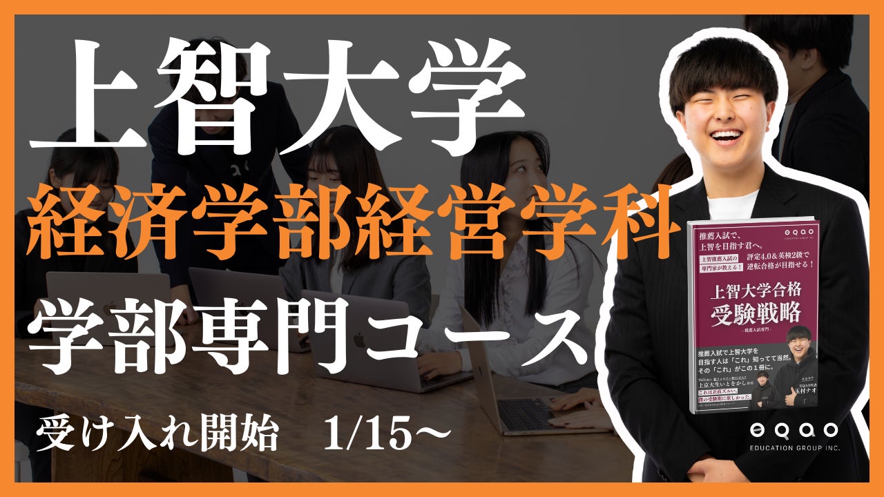 上智推薦入試専門塾EQAOでは上智経済学部経営学科専門コースの受講者を1/15から受付開始。上智特化型塾のEQAOが受験生を全力サポート。公募・推薦入試で上智大学経済学部経営学科を志望する人はEQAO