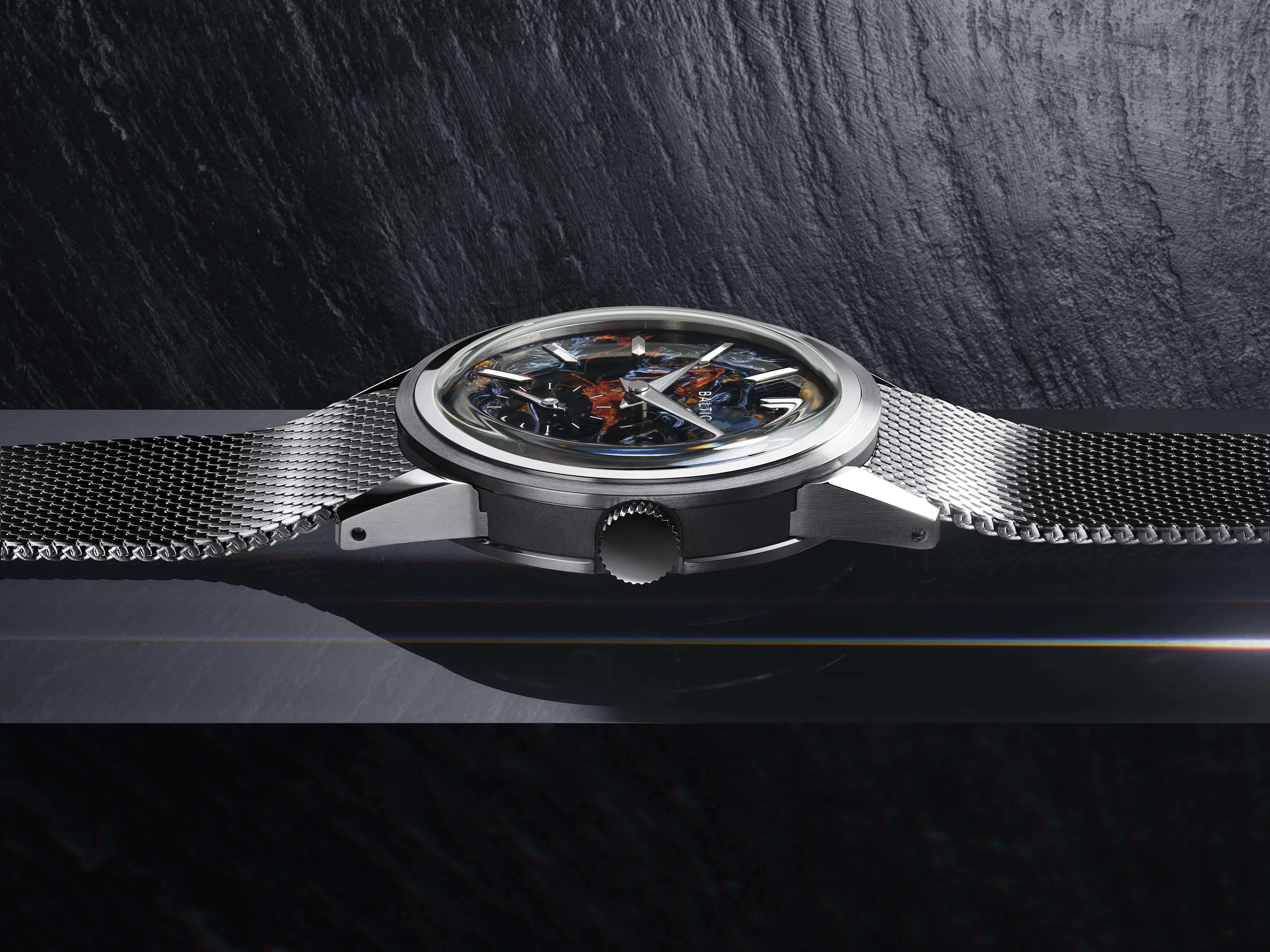 天然石の豊かな表情を引き立てるため、文字盤にはヘアライン仕上げのドーフィン針と、ポリッシュ仕上げのアプライドインデックスを配置。6時位置のスモールセコンドは石の表面に精巧に固定され、素材の美しさを損なうことなく、機能性と洗練を両立しています。36mmケースは、クラシックな“カクテルウォッチ”を想起させる5パーツ構造を採用。ベゼル、ラグ、裏蓋にはステンレススチールを、センターケースには繊細な粒感を持つグレード5チタンを使用しています。二層構造のベゼルは、上面のポリッシュと下層のサーキュラーブラッシュが柔らかなコントラストを描き、コンパクトながら高度な造形美を実現しました。