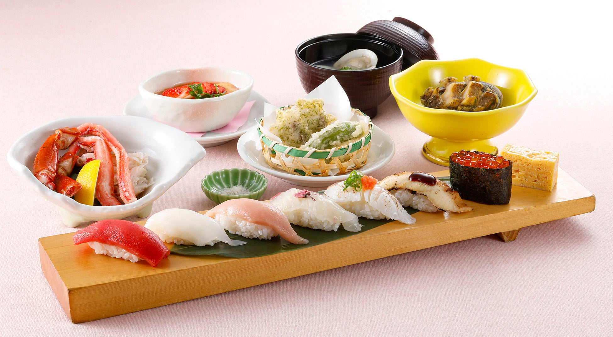 今回のフェアで限定販売する「春御膳」は、季節ネタと人気ネタを盛り合わせたお寿司7貫に、今回限定で入荷した「とげずわい蟹」の酢の物などの一品、はまぐりのお吸い物、デザートをセットした、しっかりとご満足いただけるセットメニューです。ぜひこの機会にご賞味ください。