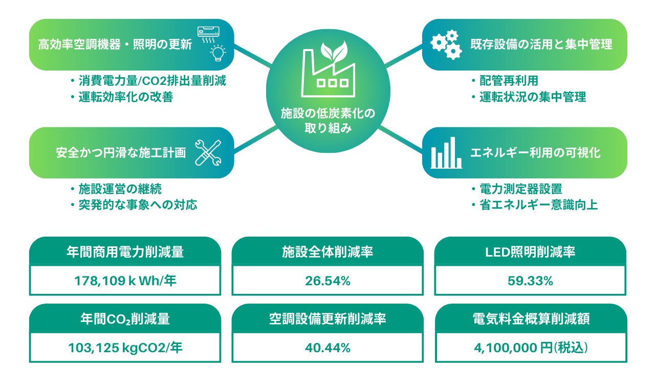 本改修工事により、年間商用電力削減量178,109kWh、CO2削減量103,125kg(削減率26.54%)の省エネ効果が期待されるとともに、年間約410万円(税込)の電気料金削減を実現し、高効率空調機器とLED照明の導入によって施設利用者に快適な環境を提供します。また、低炭素化を推進し、環境負荷の軽減を通じて地域社会への貢献にも寄与します。