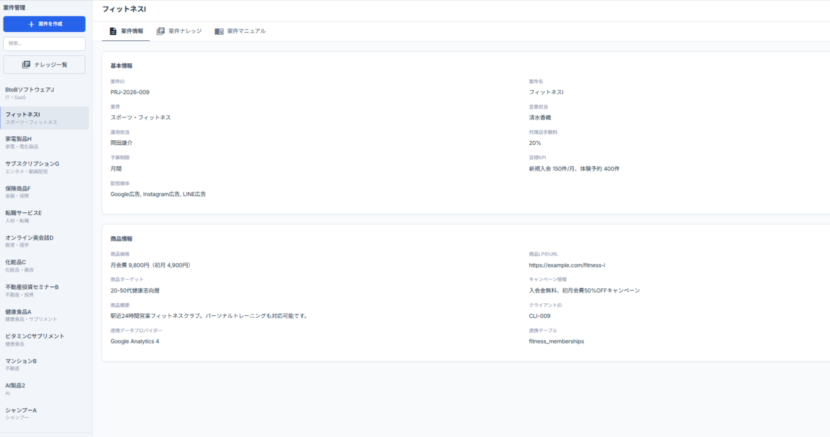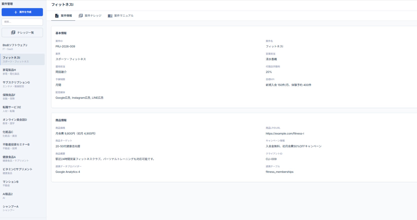 案件(クライアント)単位でプロジェクトを作成し、商材情報・案件情報・レポート設定・過去レポートを一元管理できる機能です。
