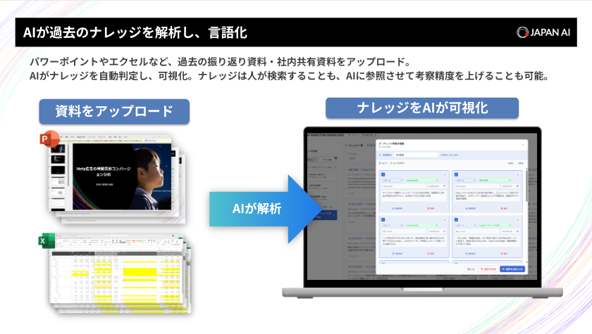 データの蓄積は自動で行われるだけでなく、PowerPointやExcelなどの既存資料をアップロードするだけで、AIがナレッジを自動判定・可視化します。これまで資料の中に眠っていた知見を、すぐに活用できる形に変換します。