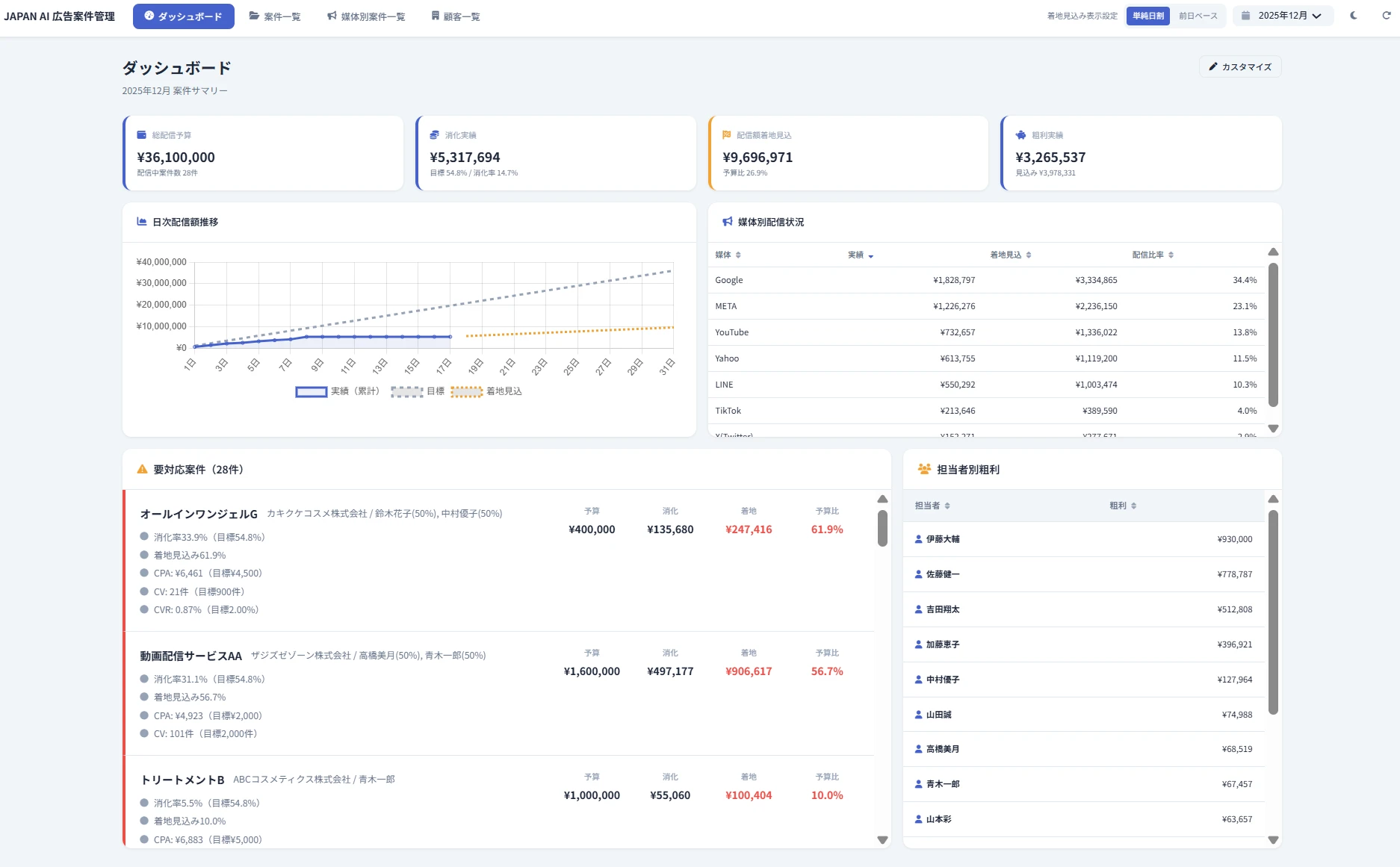 今回のアップデートにより3つの新機能が追加され、広告代理店の運用担当者・営業担当者が日常的に扱う顧客情報・案件情報・日次実績データを1つのシステムで統合管理できるようになりました。これまで代理店の担当者が手作業で行っていた集計・計算・確認作業を自動化し、運用業務の効率化を支援します。