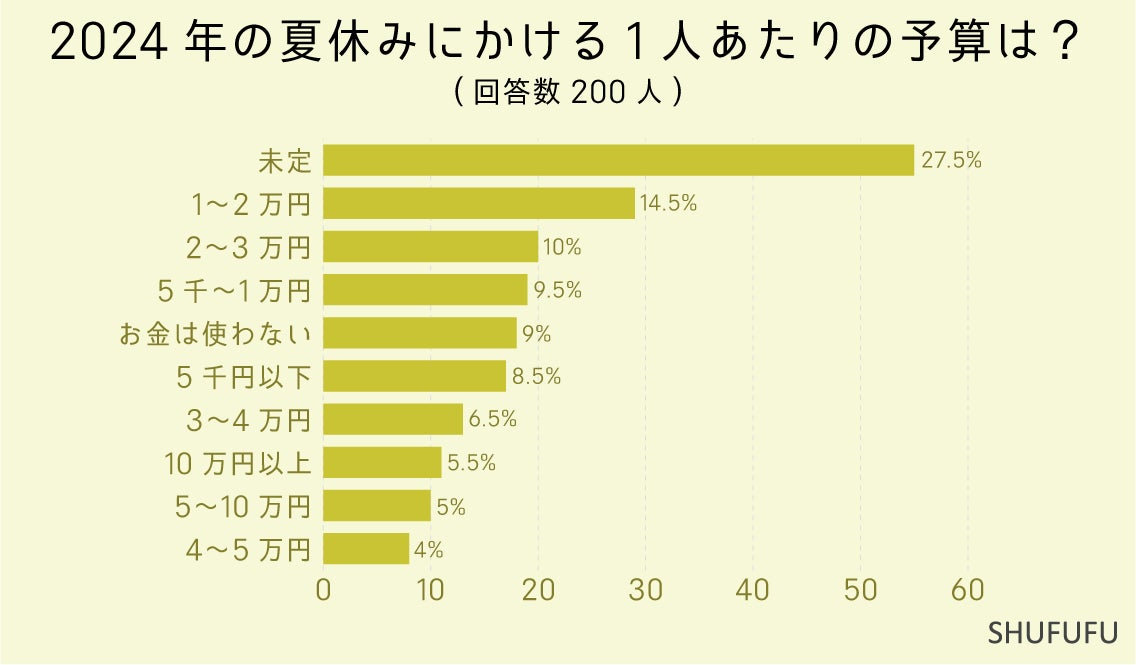 2024年の夏休みにかける1人あたりの予算では「未定」が最多でした。まだ予定がなく自宅でゆっくり過ごすことになるかもという回答も複数ありましたし、まだ具体的な予算を決めていない方が多いようですね。