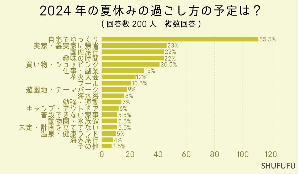 【2024年】今年の夏休みの予定は?2位は「実家・義実家に帰省」!1位は?”予算”や”夏休みで気になること”を200人に調査