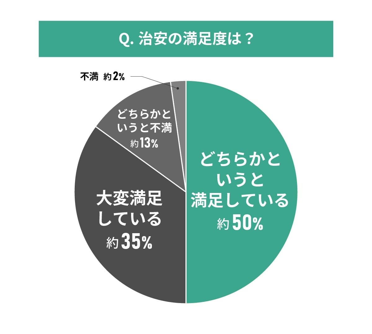 治安については約85%の住民が満足しており、安心して暮らせる環境であることがわかります。