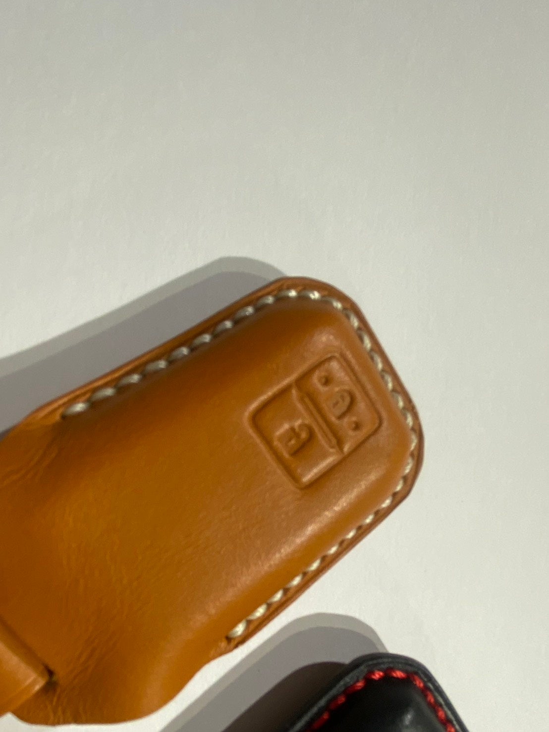 プリントではなく刻印仕上げとすることで、使い込むほどに風合いが増し、革ならではの経年変化を楽しむことができます。シンプルなデザインながら存在感があり、車好きのライフスタイルに自然に溶け込むアイテムに仕上げました。