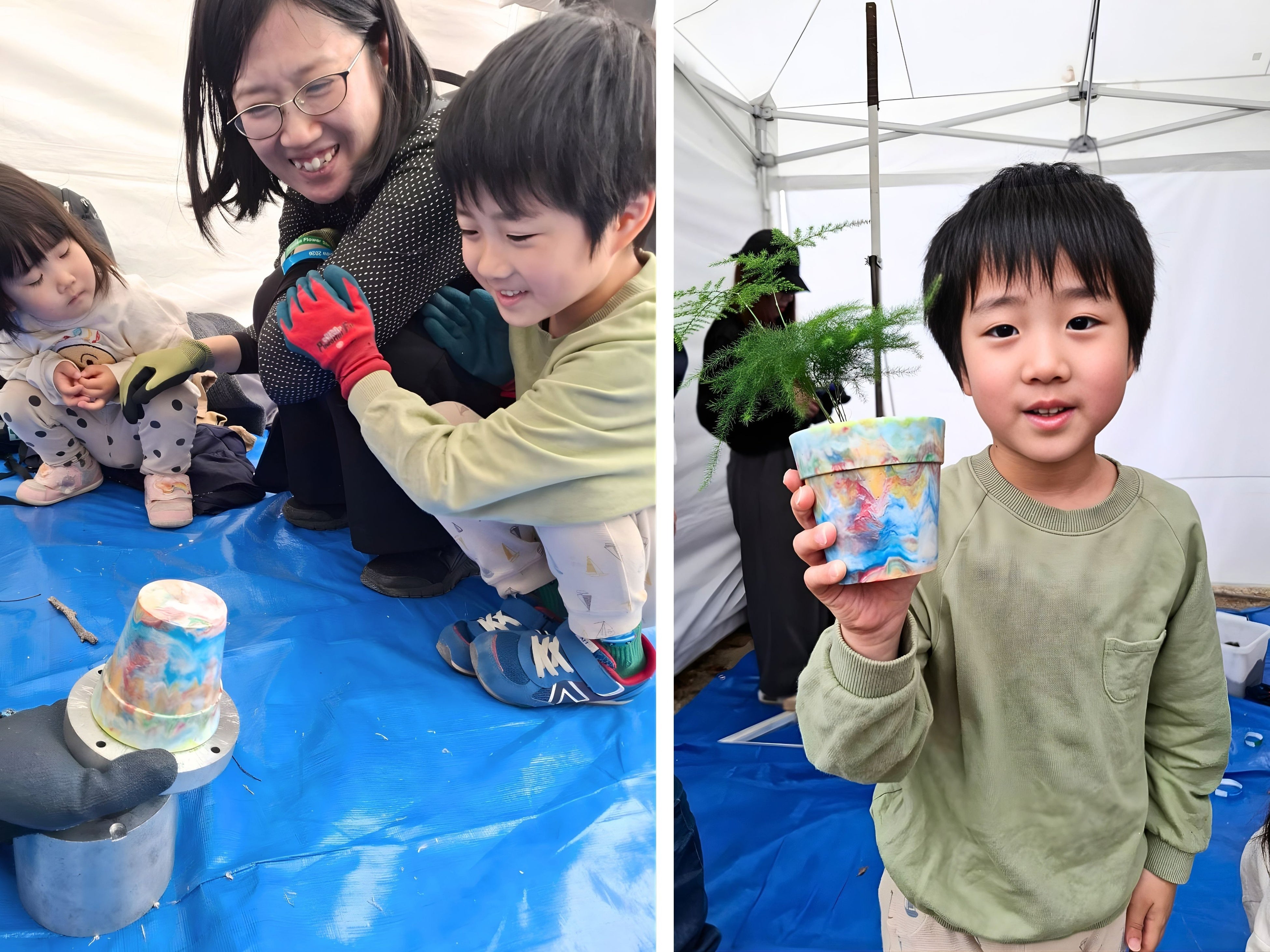 今回使用したペットボトルキャップ約1,000個は、地域から集めたもの。Precious Plastic(プレシャスプラスチック)技術を用いて加熱・成形することで、マーブル模様の美しいオリジナルフラワーポットとして生まれ変わりました。廃プラスチックが緑を育てる器になる—この小さな循環を、国際水準の花の祭典の中で体感してもらう機会となりました。