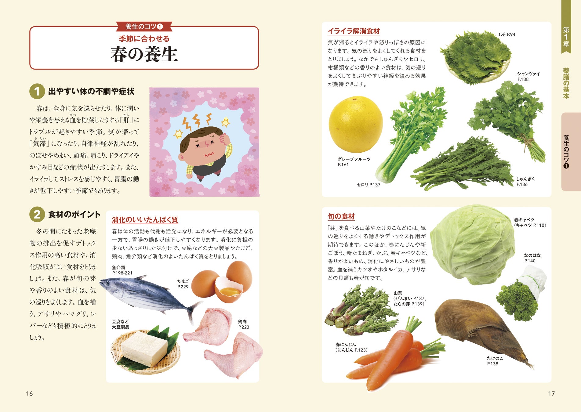 しょうが、あずきといった、特に注目の食材はより詳しく紹介。日常に取り入れやすい食材は、野菜、果物、魚介など、種類別に分けて収録。さらに「おすすめ」食材と「もっととりたい」食材とに分け、50音順に紹介しています。