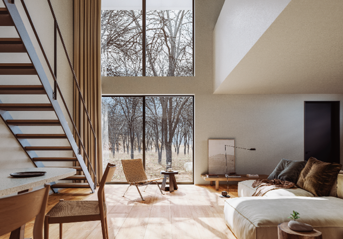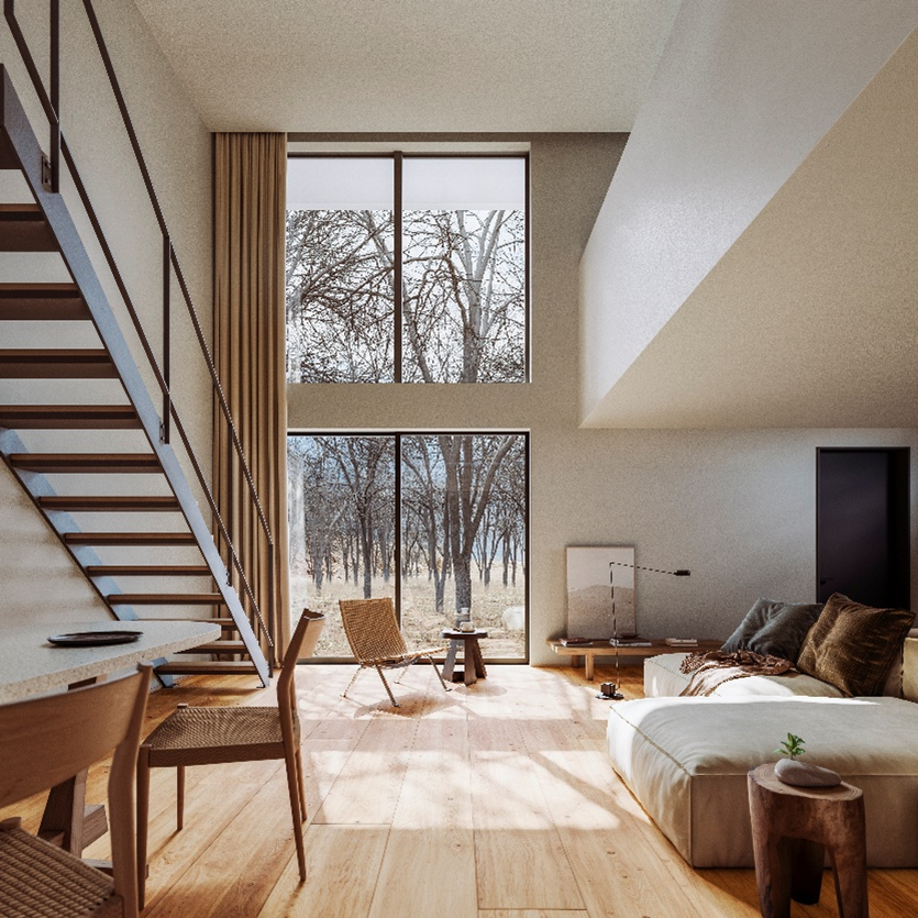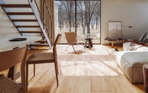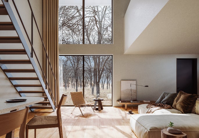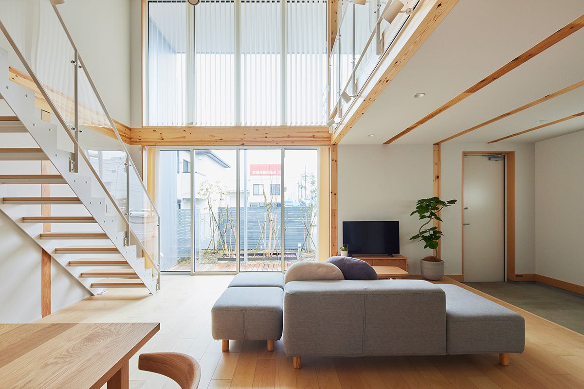 「木の家」は、2004年10月に無印良品の家の第一弾として販売を開始して以来、ご好評をいただいている商品です。本仕様では、「箱のようなすっきりとした外観」や「大きな窓や吹き抜けから得られる開放感」といった従来の特長はそのままに、床や壁の素材そのものを楽しめる内装仕様を新たに採用。また、細部にわたる簡素化を徹底することで、住まいに生まれる「余白」を愉しんでいただける設えとしております。