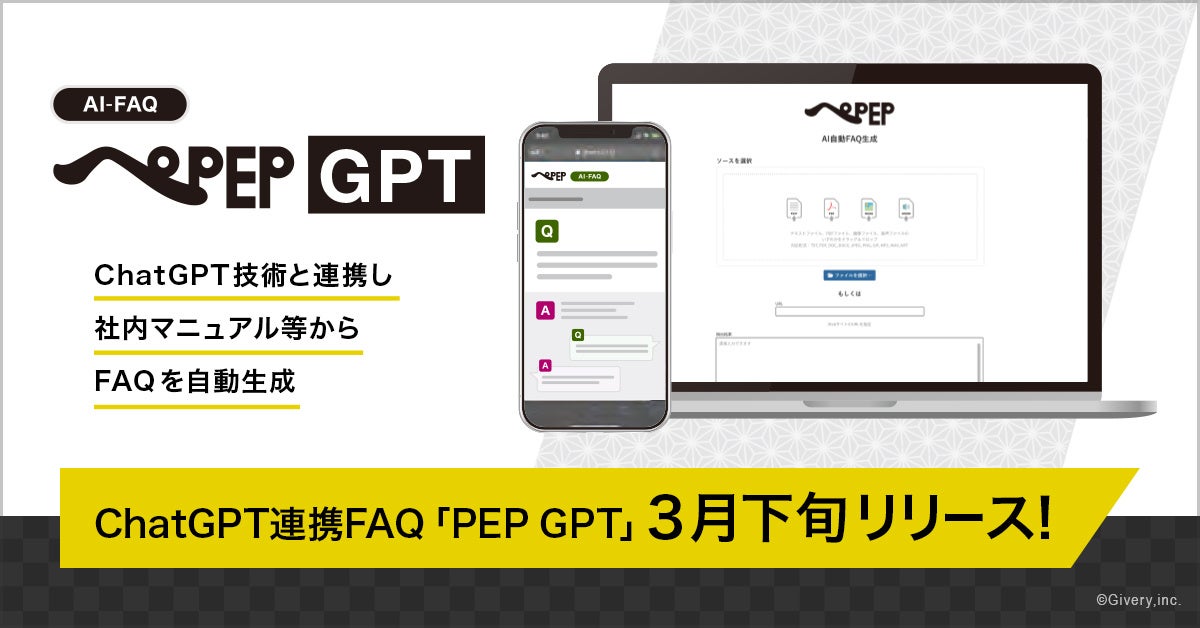 延べ1,000社以上にAIチャットボット・AI-FAQを提供する株式会社ギブリー(本社:東京都渋谷区、代表取締役社長:井手高志、以下ギブリー)は、ChatGPT等を展開するOpenAI社の各種APIと連携する新サービス「PEP GPT」(ペップ・ジーピーティー)を2023年3月下旬にリリースすることをお知らせいたします。