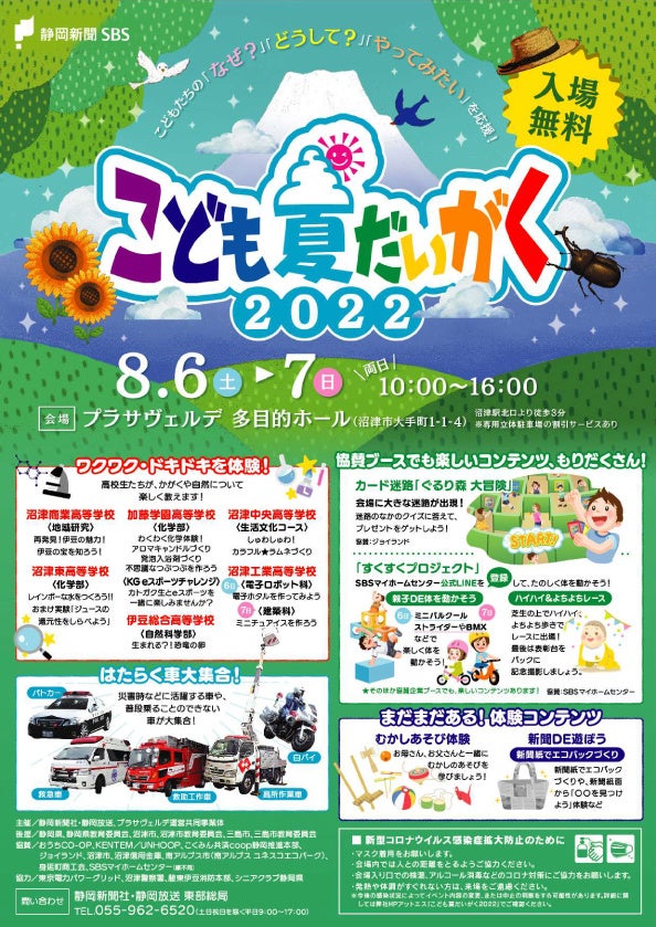 静岡新聞SBSが主催する「こども夏だいがく」は、こどもたちの「なぜ?」「どうして?」「やってみたい」を応援するイベントです。カラフルなラムネづくりやミニチュア椅子づくり、伊豆半島ジオパークをすごろくで学んだりなど、高校生たちがかがくや自然について楽しく教えてくれます。