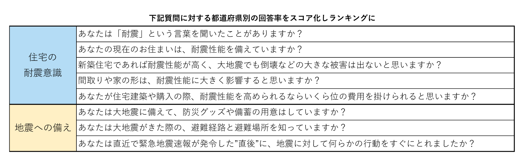 本調査を通して、各都道府県の耐震意識や地震への備えが明らかになりました。地域ごとに大きな差がある一方で、上位の県でも100%の方が耐震意識を持ち、完璧に地震に備えているわけではありません。