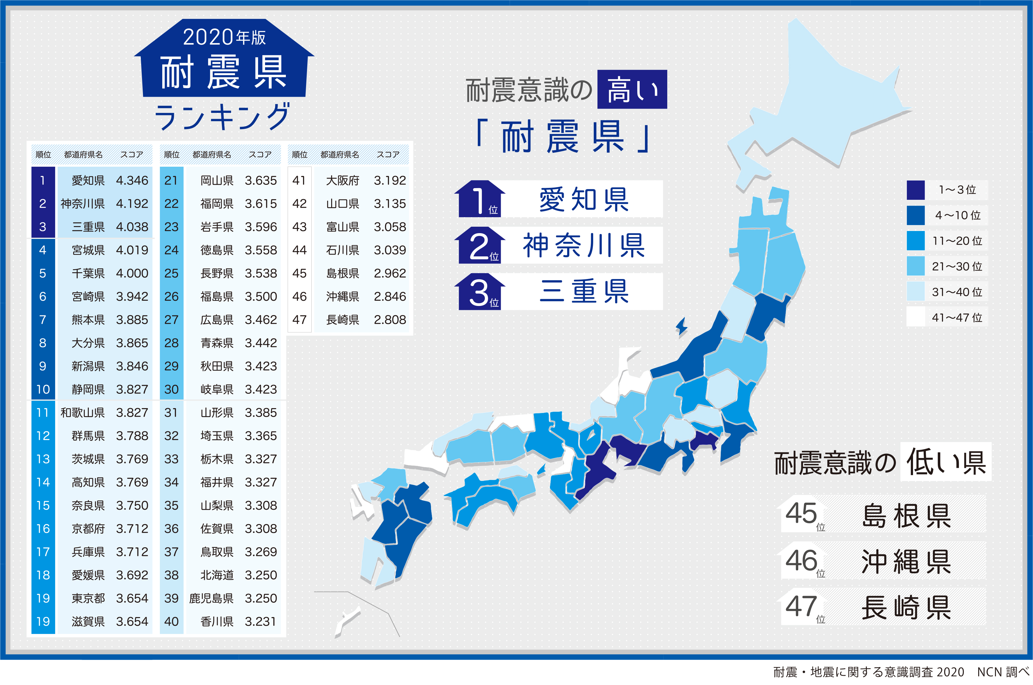 耐震県ランキングは昨年20位の愛知がトップ、昨年44位の長崎は最下位に
