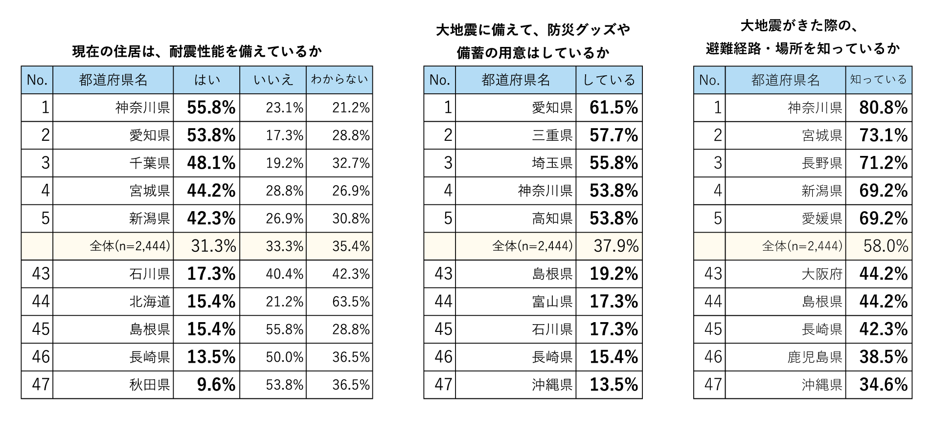 昨年に引き続き、全国の2,444名に対して「住宅の耐震意識」と「地震への備え」に関する調査を実施。その都道府県別回答をスコア化し、各設問分を合計した値をもとに「耐震県」ランキングを作成いたしました。すると上位は1位「愛知」(昨年度20位)、2位「神奈川」(昨年度1位)、3位「三重」(昨年度12位)、4位「宮城」(昨年度4位)、5位「千葉」(昨年度8位)という結果になりました。東日本大震災など近年被災した県、南海トラフ地震などの大地震が想定されている県などが関心の高さから上位にランクインする中、昨年に引き続き東日本大震災による県外からの転入世帯も多い「神奈川」も高いスコアを記録しました。