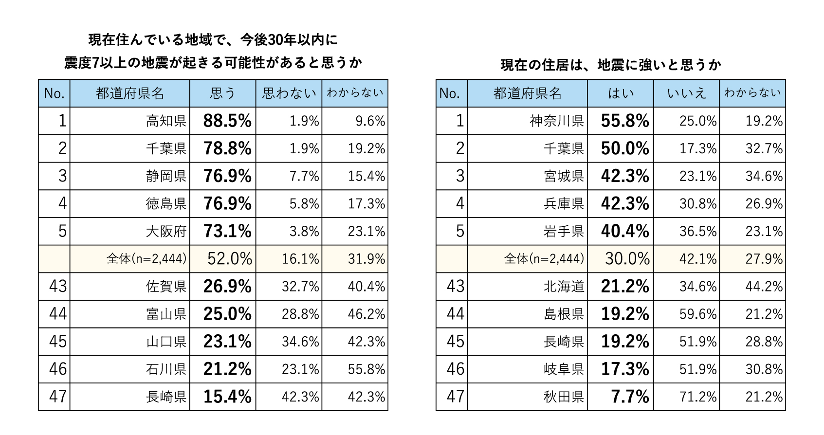 ランキングに関する設問とは別に、地震に対する意識を知るべく「自分の住むエリアで、今後30年以内に震度7以上の地震が起きる可能性があると思うか」について伺うと、「高知」88.5%、「千葉」78.8%、「静岡」76.9%と、4分の3以上の方が大地震を想定している県も存在する一方で、耐震県ランキングで下位となった「長崎」「石川」「富山」などでは4分の1程度に留まるなど、都道府県によって大きな差が見られました。