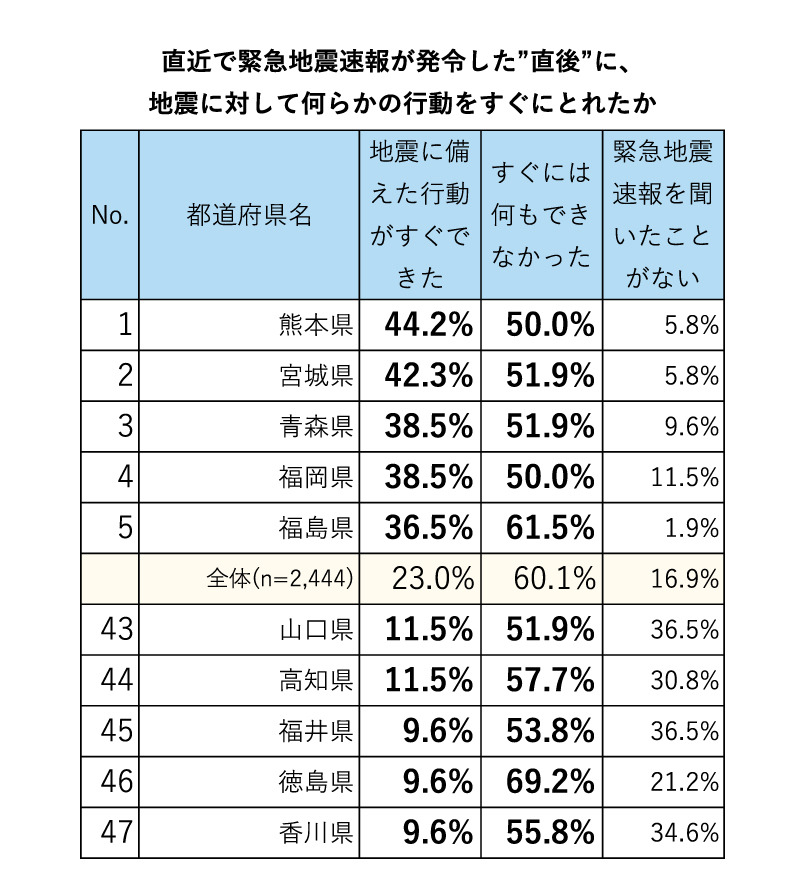 また、「直近で緊急地震速報が発令した”直後”に、地震に対して何らかの行動をすぐにとれたか」という設問に対しては、「熊本」「宮城」「福島」など、大きな地震を経験した件で「行動できた」人の割合が高い一方で、どの県でもおよそ半数以上の方が「すぐには何もできなかった」と回答。有事の際の行動にはまだまだ課題があると考えられます。