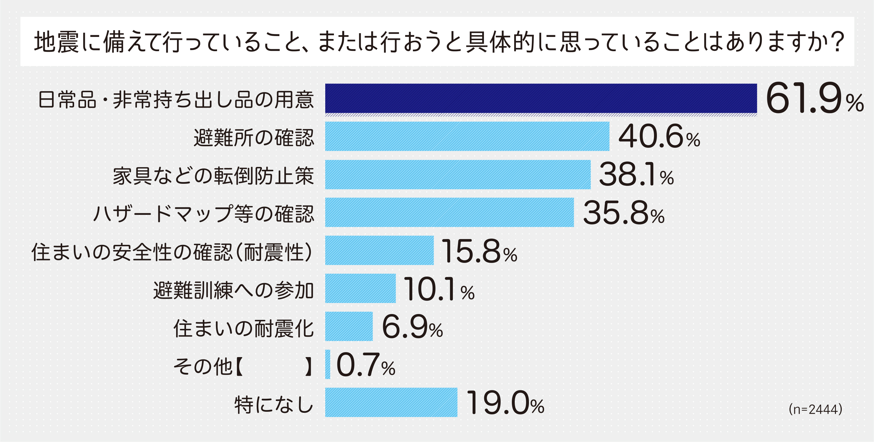 また、地震への備えに関する意識を更に知るべく「地震に備えて行っていること、または行おうと具体的に思っていること」を質問すると、全体で最も多かったのは「日常品・非常持ち出し品の用意」が61.9%、次いで「避難所の確認」40.6%、「家具などの転倒防止策」38.1%という結果となりました。一方で、「耐震性の確認」や「住まいの耐震化」といった自宅の状態に関わる行動については、それぞれ15.8%、6.9%、「避難訓練への参加」も10.1%に留まりました。
