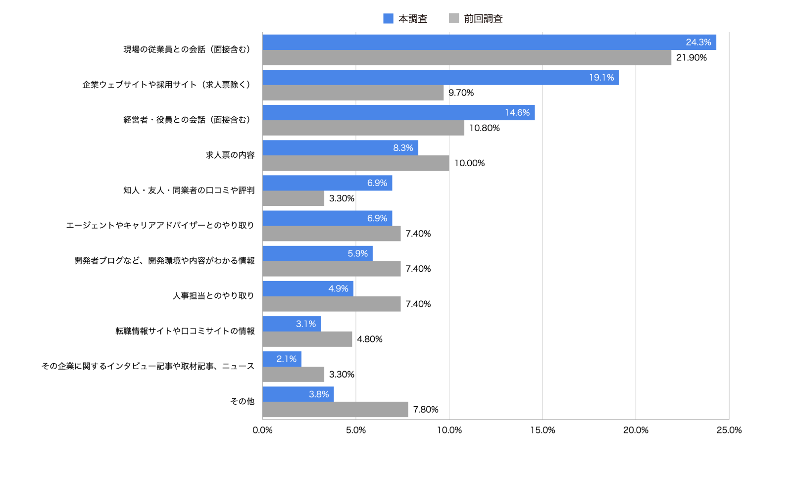 ネガティブな意見も含め、率直な意見を聞くことができる現場エンジニアとの会話が、最も参考になるという意見が目立ちました。前回調査との比較では、「企業ウェブサイトや採用サイト(求人票除く)」の回答が大きく増加(9.7%→19.1%)し、「人事担当とのやりとり」「エージェントやキャリアアドバイザーとのやり取り」の回答が減少していることから、候補者は一次情報を重視する傾向がより強まっていると考えられます。