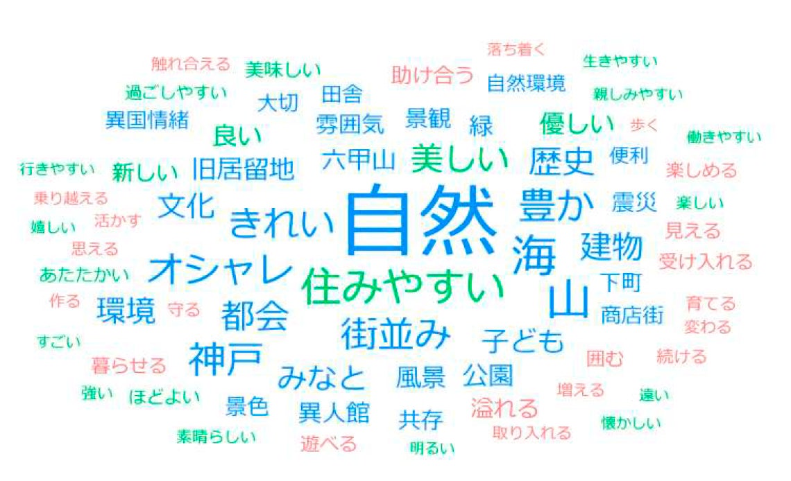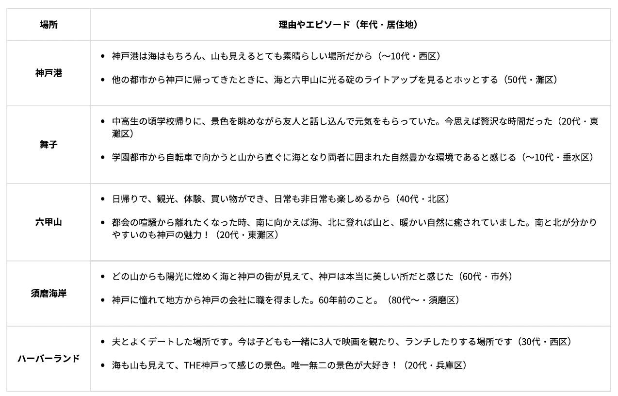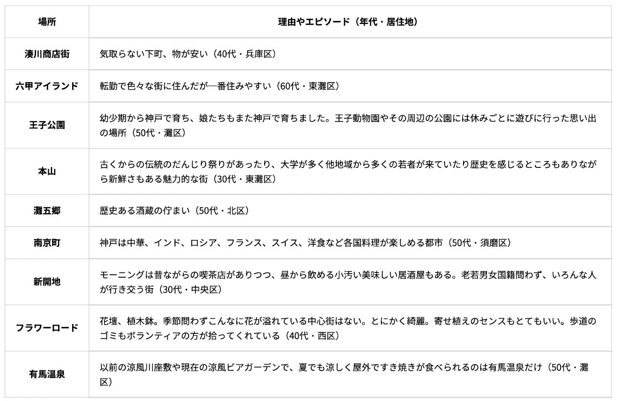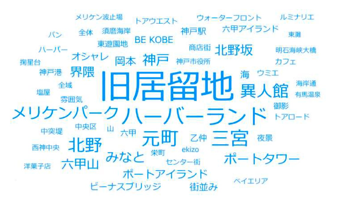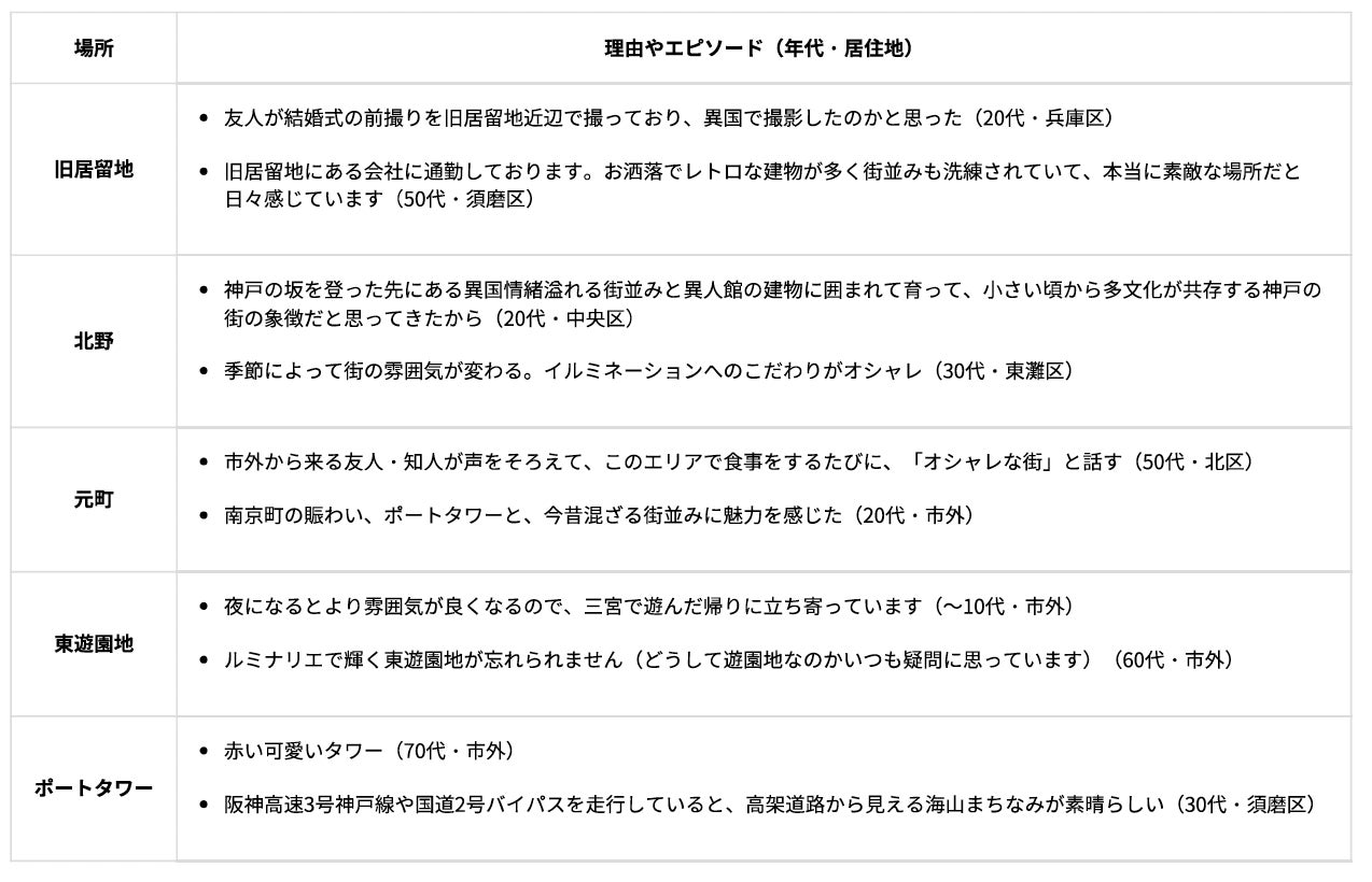 アンケートは選択式の設問である「神戸の『まち』の魅力といえば?」と、記述式の「それぞれの『連想する場所』と『理由・エピソード』を聞くアンケートを実施しました。