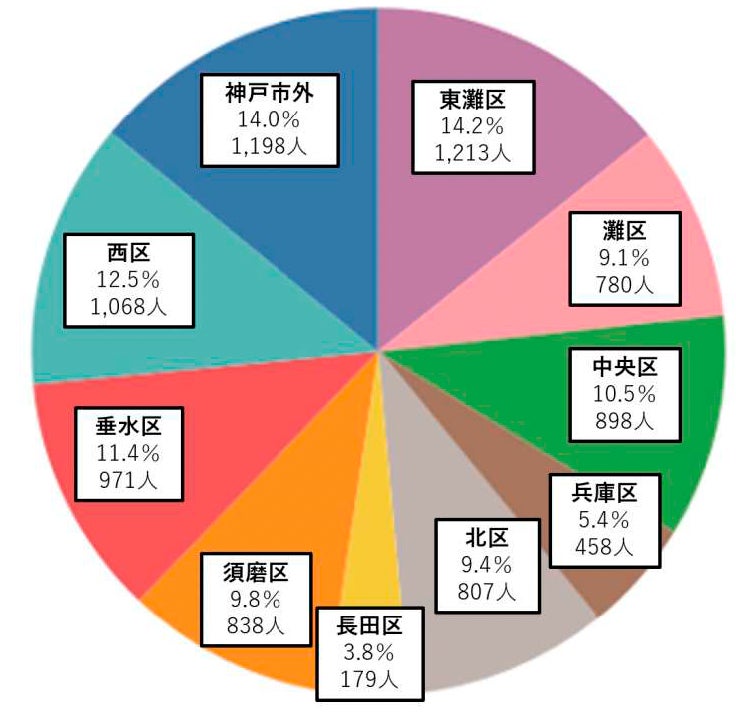 第二弾アンケートは、世代別で、10代、20代、30代で33.8%を占めるほか、40代が人数では一番多い2,224名と働き盛りの方が「これからの神戸」を深掘りしたい意向がアンケートから見られました。居住地別では、東灘区が14.2%と一番多く、西区、垂水区、中央区が続きました。神戸市外の方も14%と多く、神戸市外に居住されている方の注目も高かったです。