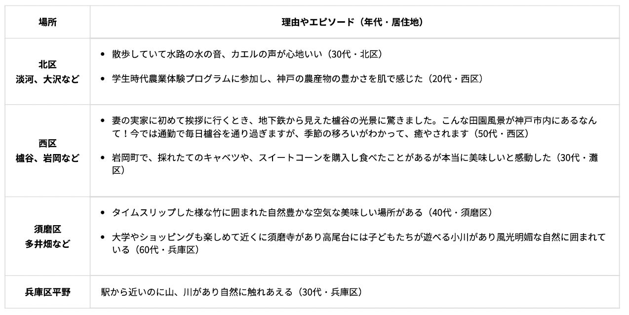 選択式のアンケートに続いて、その内容を深掘りする記述式の「それぞれの『連想する場所』と『理由・エピソード』を聞くアンケートも実施しました。いただいた回答の一部をご紹介します。