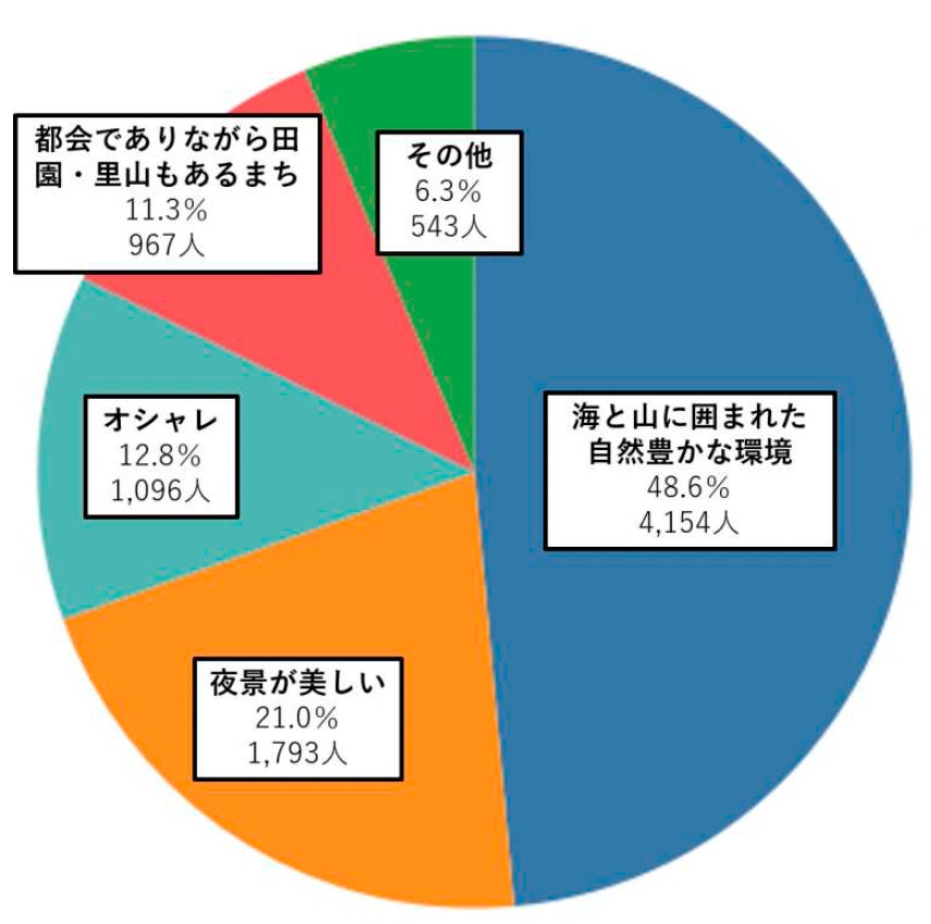 選択式のアンケート結果は、「(1)海と山に囲まれた自然豊かな環境」が第一弾アンケートに引き続き最多の4,154名で48.6%でした。「(2)夜景が美しい」、「(3)オシャレ」、「(4)都会でありながら田園・里山もあるまち」が続きました。