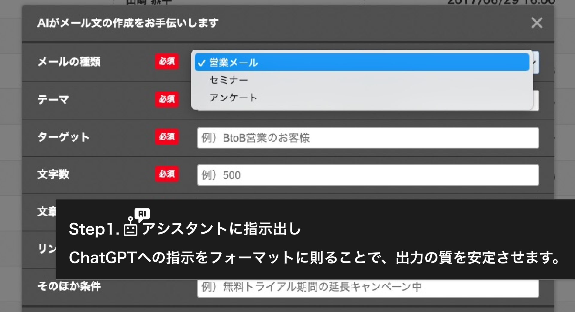 プロンプトとは、ChatGPTへの質問の仕方のことです。質問の仕方によっては期待している結果が得られない場合があります。ChatGPTを最大限活用し、成果に繋げるには、この「プロンプト」が非常に重要になります。ジオコードでは、このプロンプトを数ヵ月にわたり研究し、メール作成に適した仕様にしてネクストSFA内に組み込みました。