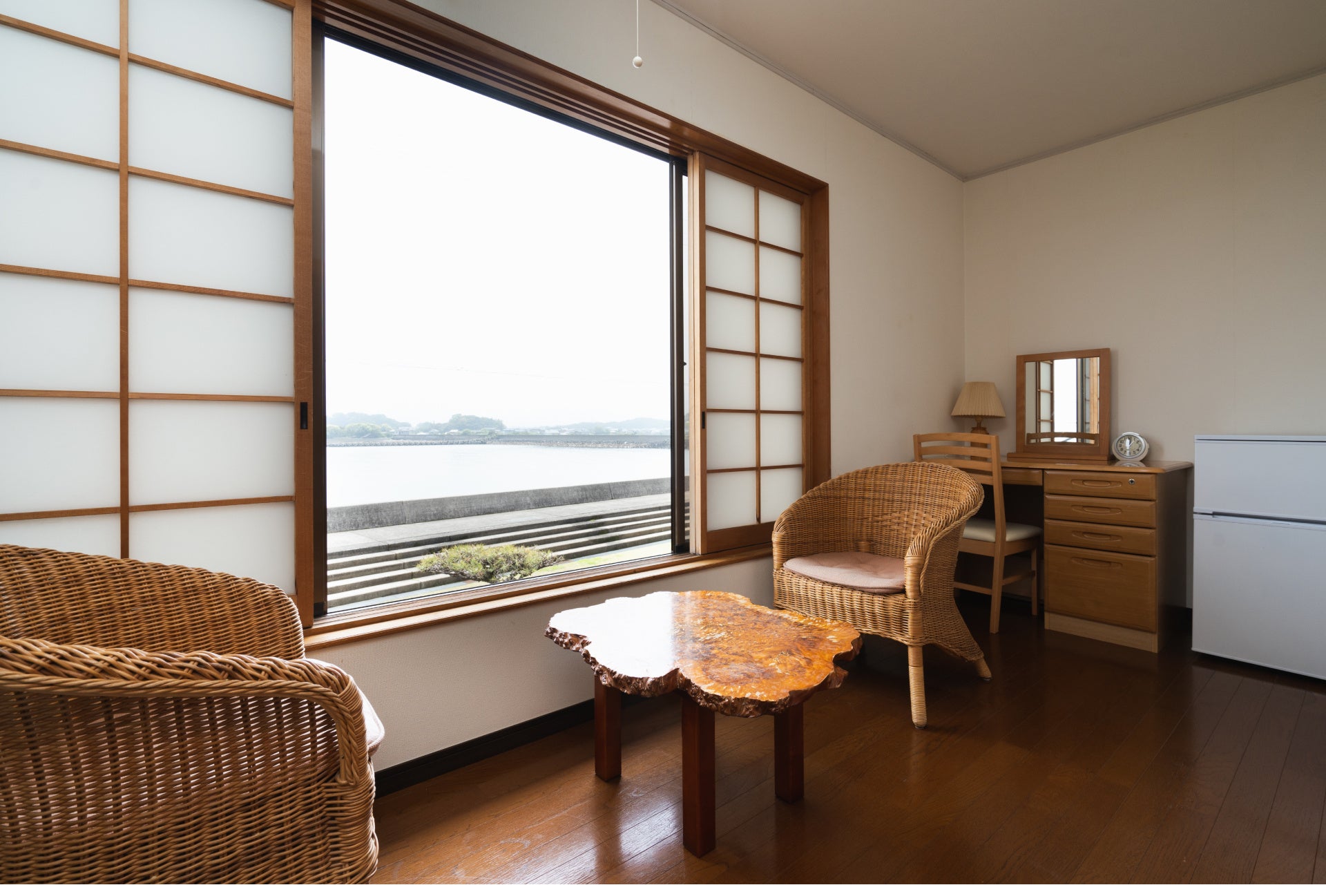 留学中の拠点は、園から車で5分の場所にある「アミーマンボス」。穏やかな瀬戸内海と安戸池に挟まれた静かなところで、刻一刻と移り変わる美しい海と空の眺めを味わいながら落ち着いて過ごすことができます。お部屋はベッドルームと和室、サンルームを改装した寛ぎのスペースの全3室。Wi-Fi完備の自室だけでなく、宿1階にあるワークスペース兼図書室や開放的なラウンジスペース、キッチンスペースも利用でき、オンオフともに快適に滞在できます 。