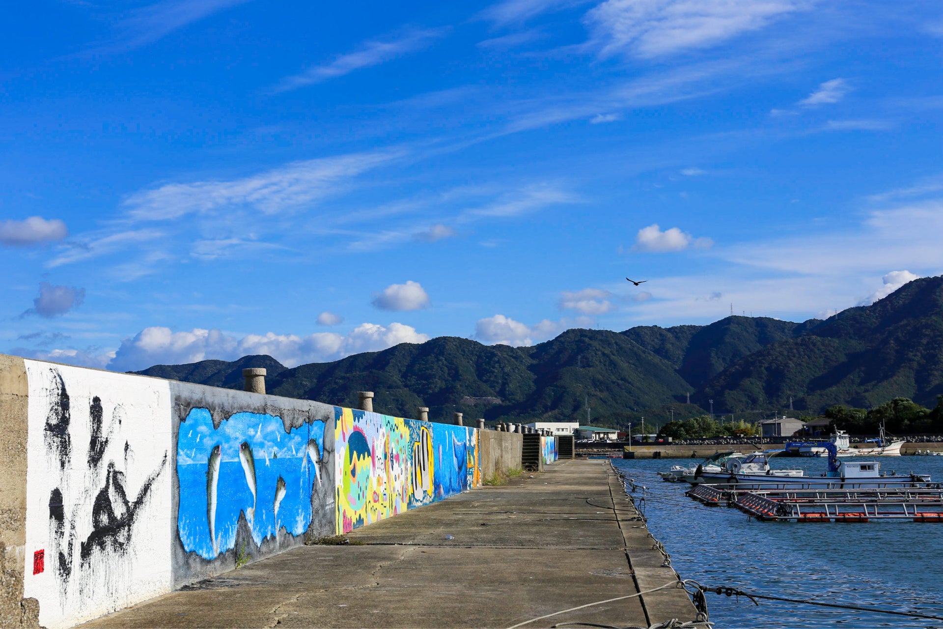 引田地区は、海と山両方の自然を楽しめるエリア。昼にはサイクリングやハイキングを、夜にはキャンプ場で星空観察や月光浴などを楽しめます。引田漁港の堤防には、色とりどりの個性豊かな絵が描かれており、波止場にある全長200メートル以上にも及ぶ「湾岸アート」は新しいフォトスポットとして人気を集めています。また食においては、江戸時代から続く和三盆糖の製造や、世界で初めてハマチの養殖を成功させた土地として、日本の伝統文化を今もなお色濃く残している地域です。