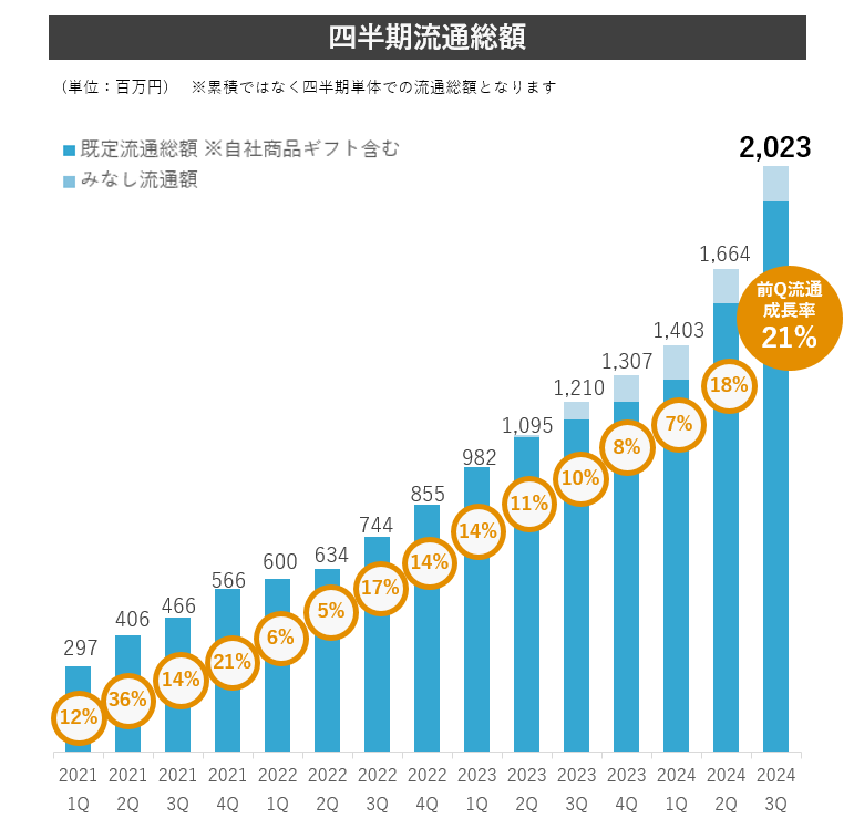 当社は、2027年9月期流通総額1,000億円の目標に向けて、資金移動業の取得、デジタル給与払いの取得に向けた動きなど、サービスとしての品質向上、また、カスタマーサクセスによるクライアント満足度向上及び営業活動の強化を推進しております。結果として、2024年9月期第3四半期において流通総額が20億円を突破、17四半期連続成長を実現いたしました。
