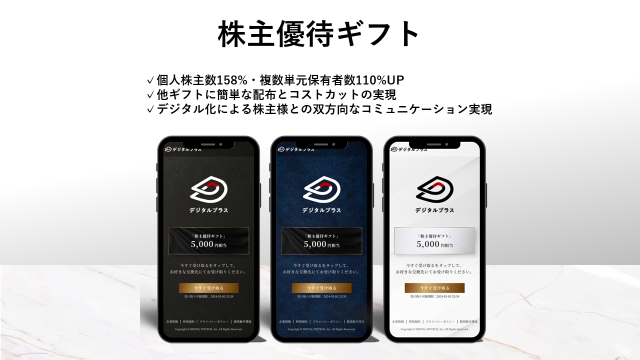 デジタルプラス社自らも株主優待として「株主優待デジタルギフト」を導入し、複数単元以上の株主を対象にデジタルギフト®を配布しました。