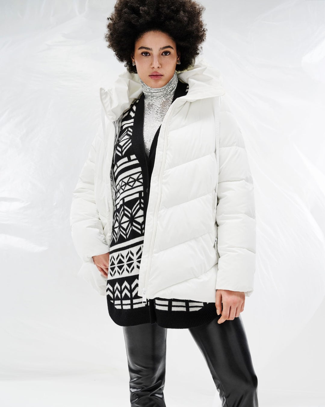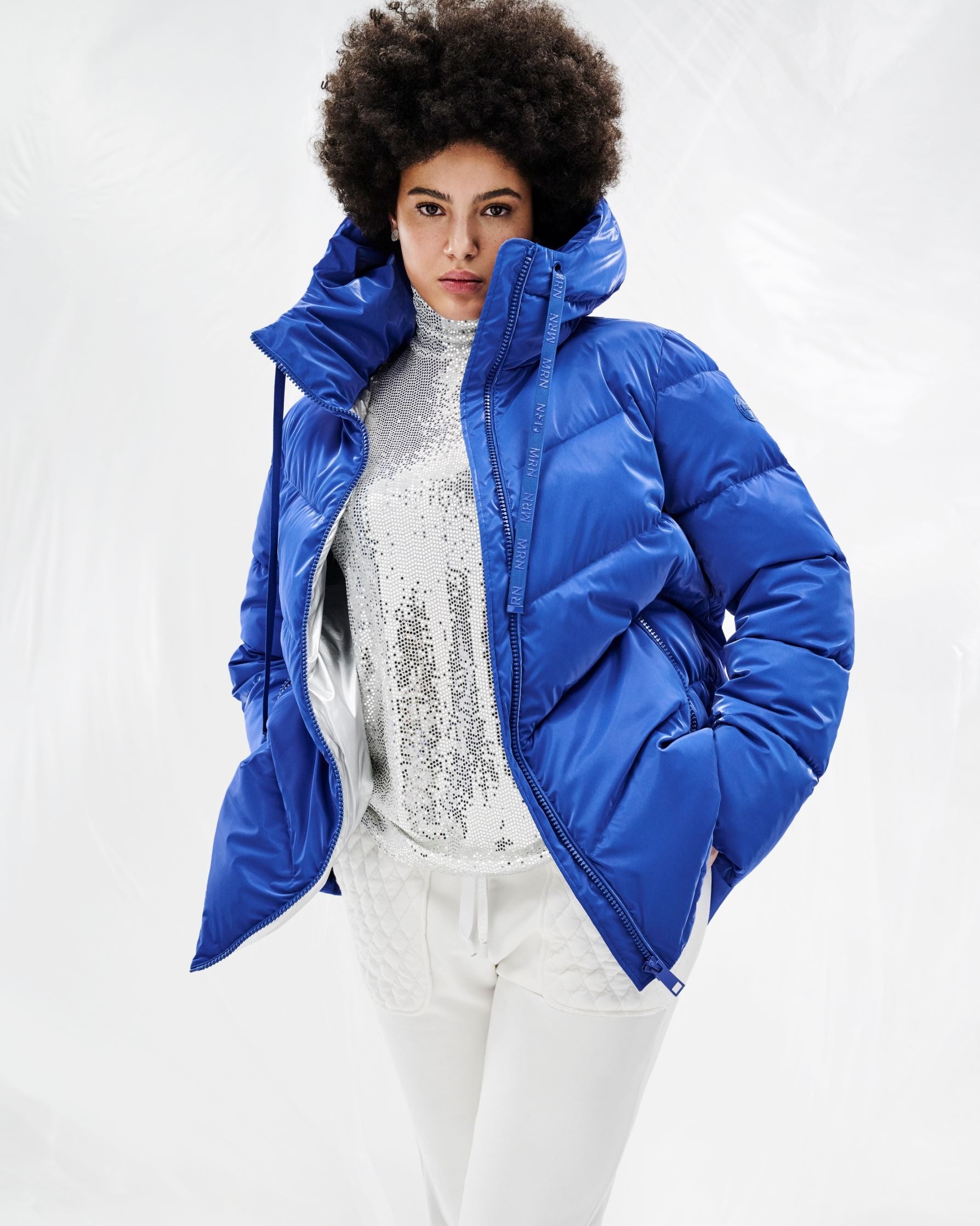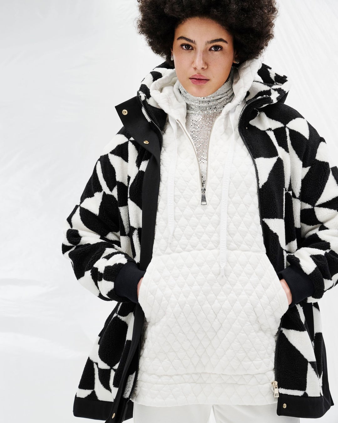 上質なキルティングジャージーを採用したVネックのマキシプルオーバー、ジップネックとマキシパッチポケットを備えた七分袖のチュニック、シルバーのマイクロスパンコールをあしらった光沢のあるタートルネックでスタイリングは完成します。一方で足元はウルトラブラックの超光沢のあるレギンスでしっかりと包まれています。