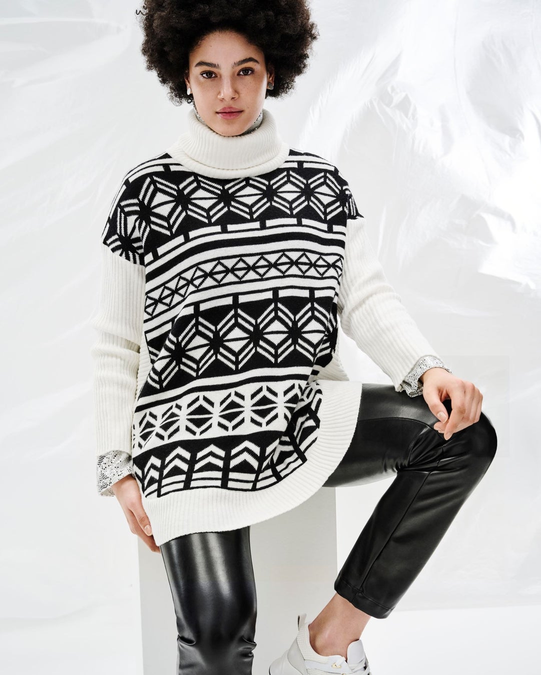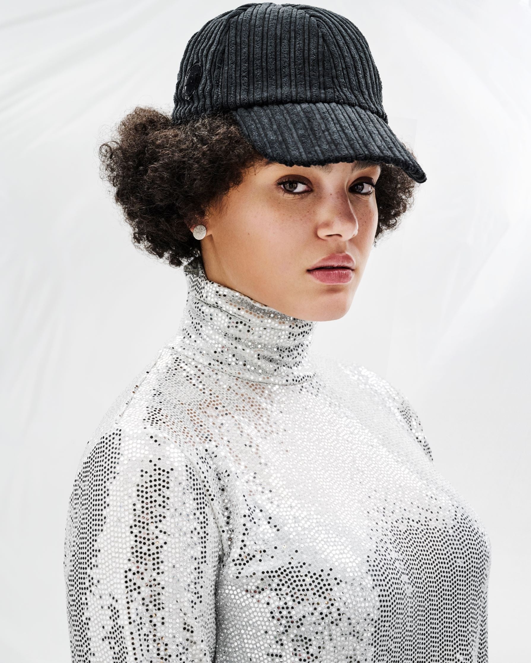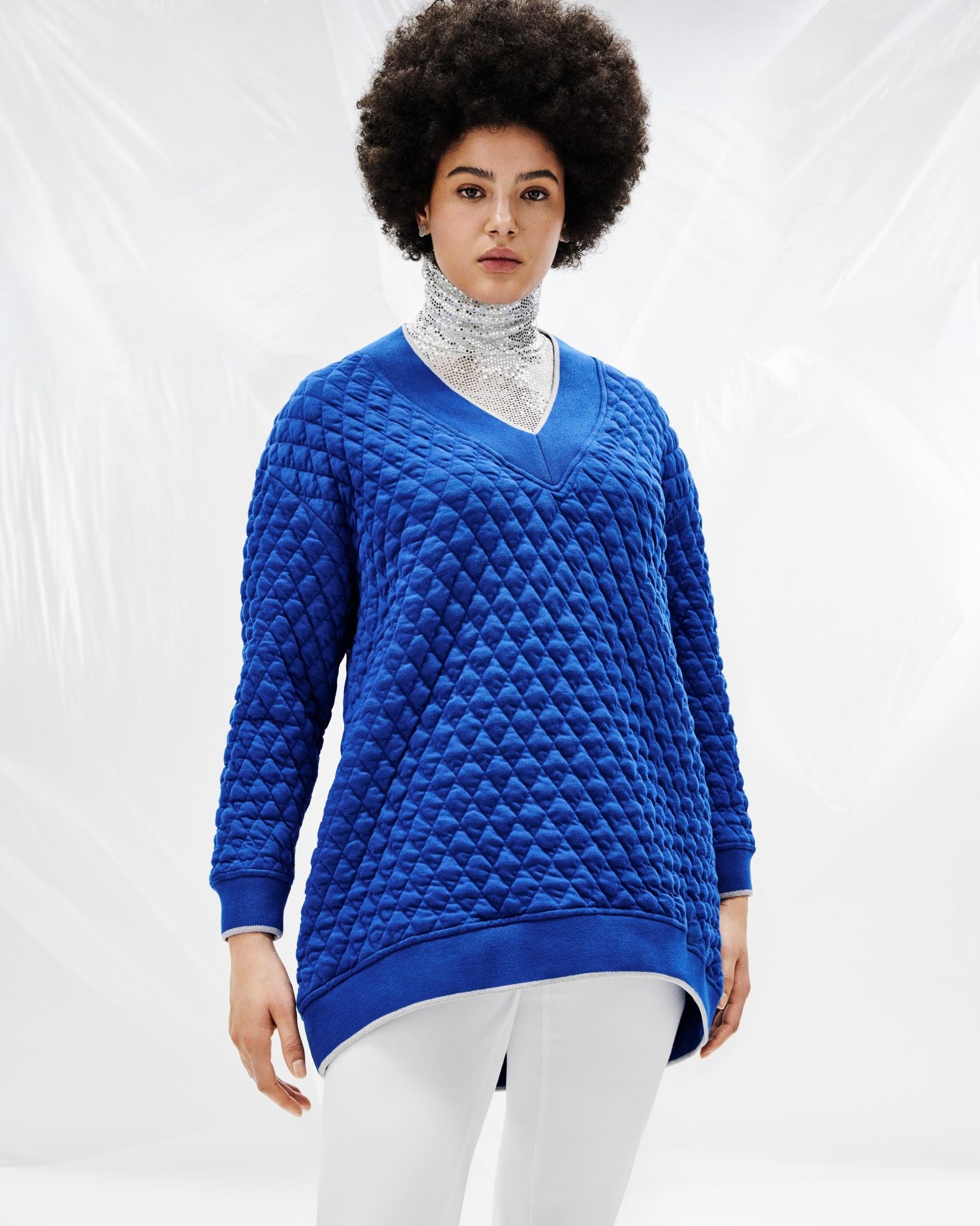 上質なキルティングジャージーを採用したVネックのマキシプルオーバー、ジップネックとマキシパッチポケットを備えた七分袖のチュニック、シルバーのマイクロスパンコールをあしらった光沢のあるタートルネックでスタイリングは完成します。一方で足元はウルトラブラックの超光沢のあるレギンスでしっかりと包まれています。