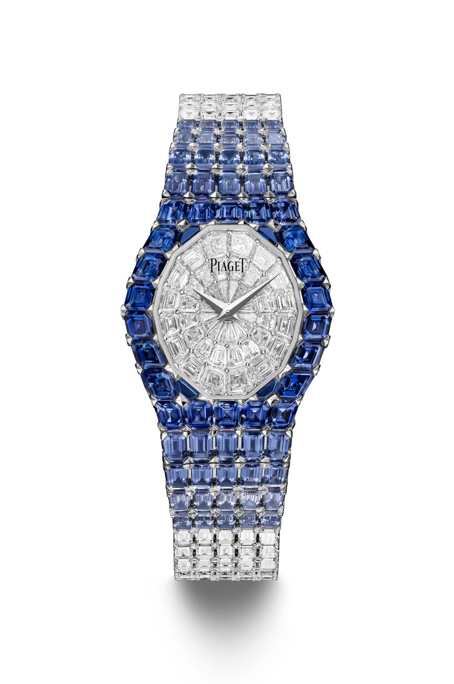 ピアジェはこのたび、ダイヤモンドとサファイアを組み合わせた新作の「オーラ」を発表します。ウォッチのフォルムに合わせ調整されたバゲットカットのダイヤモンドは、一体化したケースとブレスレットに完璧にフィッし、ブルーサファイアは見事なグラデーションを描きます。このウォッチに完璧に調和するストーンを調達、選定し、デザインを完成させるまでには、8か月以上を要しました。430Pピアジェ自社製薄型手巻ムーブメントが搭載されたこのウォッチは、薄型の爪で見えないようストーンセッティングを施すことで、クリエイションが最大限の光を反映し、他に類を見ない輝きを放ちます。文字盤のサンレイ装飾も、このデザインに一層輝きを与えています。
