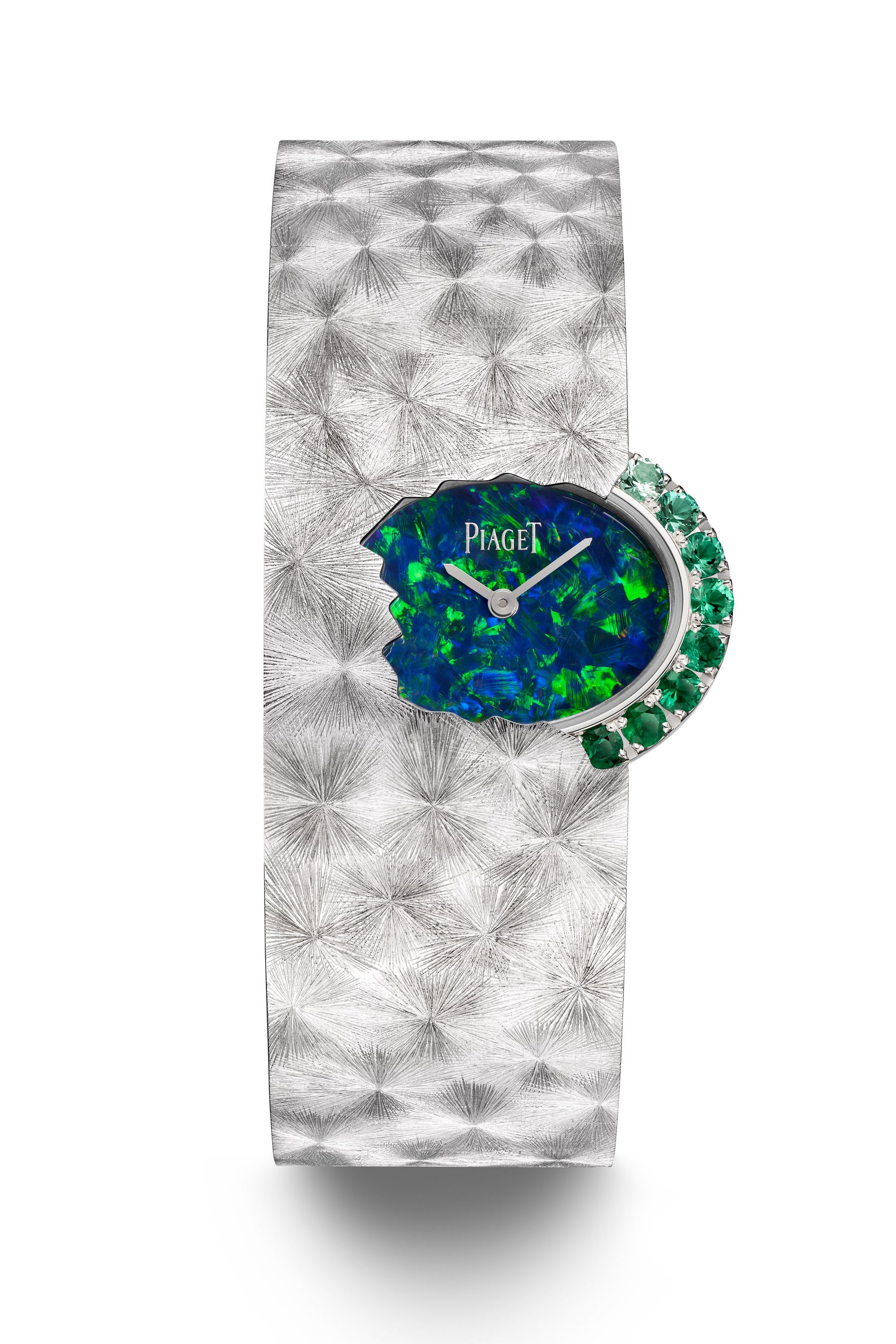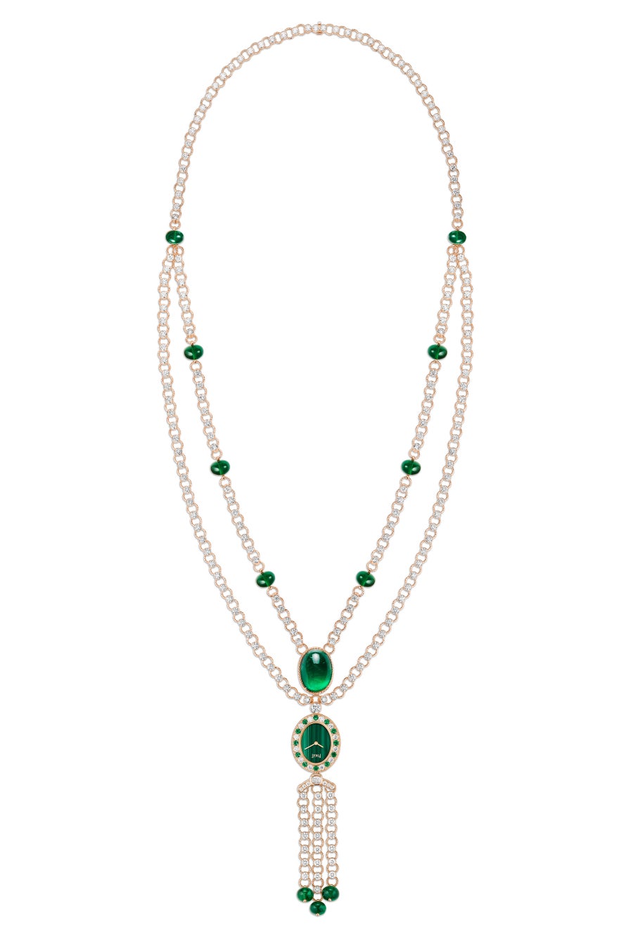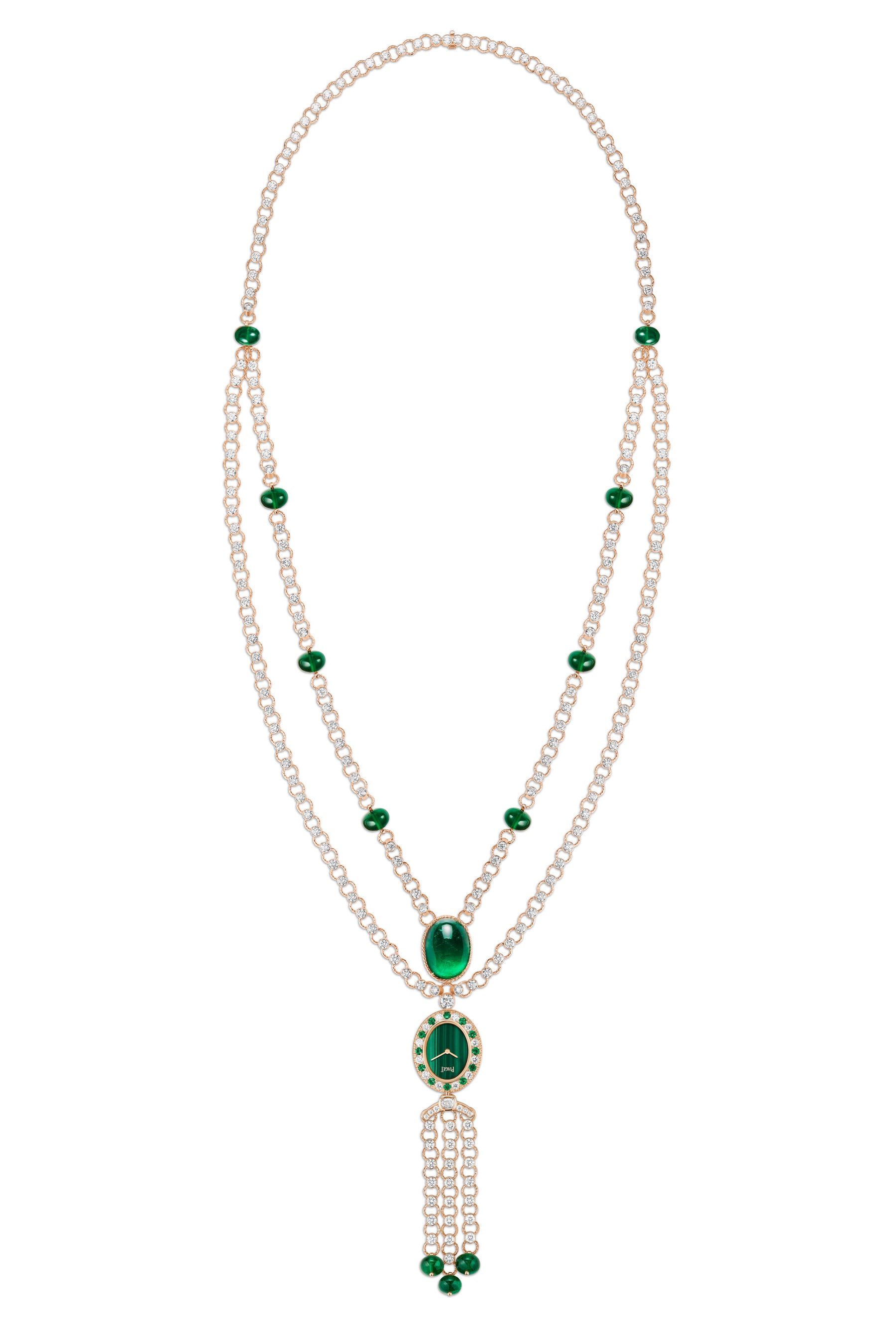 ゴールドのツイストチェーンは、1本のワイヤーをマンドレルに巻き付けてコイル状にし、すべてが同じ形になるように1つずつ手作業で慎重に撚ってから、最終的に組み合わされます。完成までに130時間を要すこのクリエイションのチェーンは手作りであるがゆえにユニークピースであり、唯一無二の魅力をたたえています。美しいタッセルスタイルのソートワールウォッチは、1960年代以来ピアジェのシグネチャーとして知られるオーバル型の文字盤に合わせて、約25.38ctのザンビア産のカボションカットエメラルドがセッティングされています。