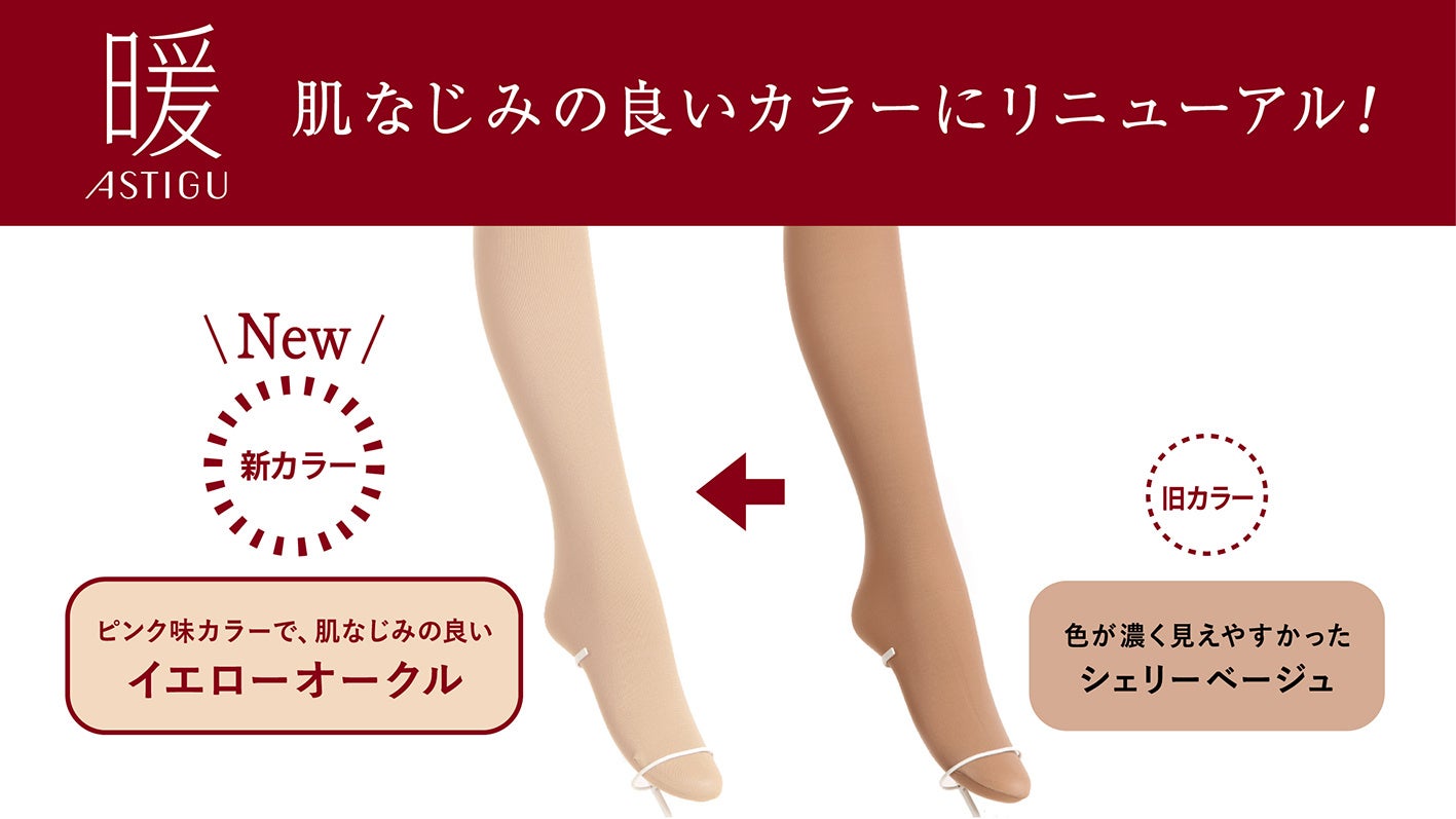 アツギ株式会社(本社:神奈川県海老名市、代表取締役社長:日光信二)は、プレーンストッキング・タイツの主力ブランド「ASTIGU/アスティーグ」の冬の定番タイツ【暖】のベージュカラーをトレンド感のある明るいベージュ「イエローオークル」にリニューアルいたします。新カラーの「イエローオークル」は、肌なじみが良く、自然な脚もとを演出します。店頭では8月下旬より順次展開いたします。