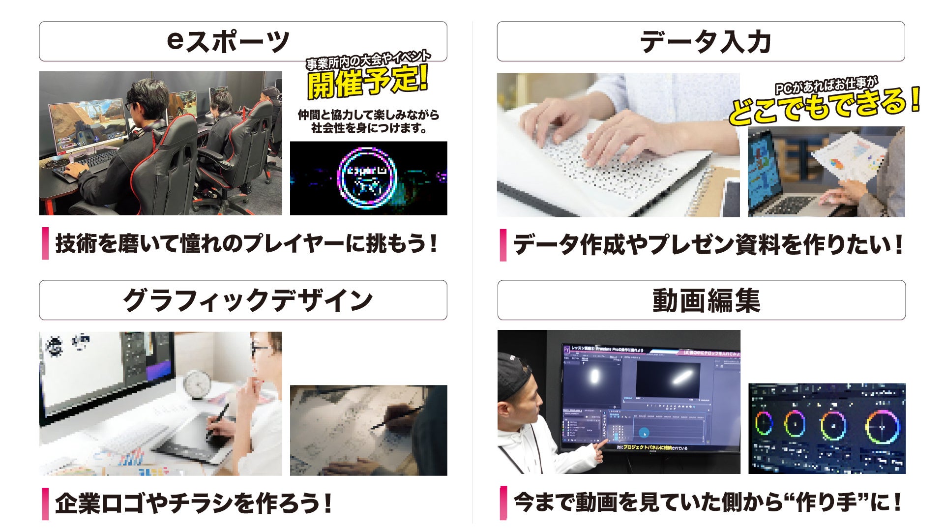 サービスの内容として、世界で急成長している「eスポーツ」と、SNSや動画配信サービスの流行から人手不足となっている「動画編集」にフォーカスし、パソコンスキルを身に付けることのほか、ご利用者様が自己表現力を向上させ、自信を持つためのサポートと、有給の仕事の依頼を請ける機会をご提供いたします。
