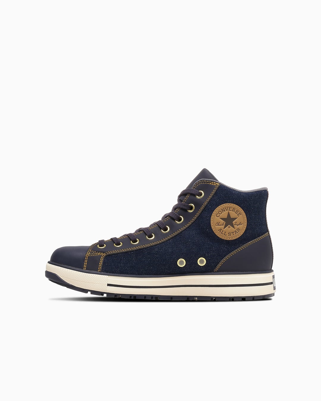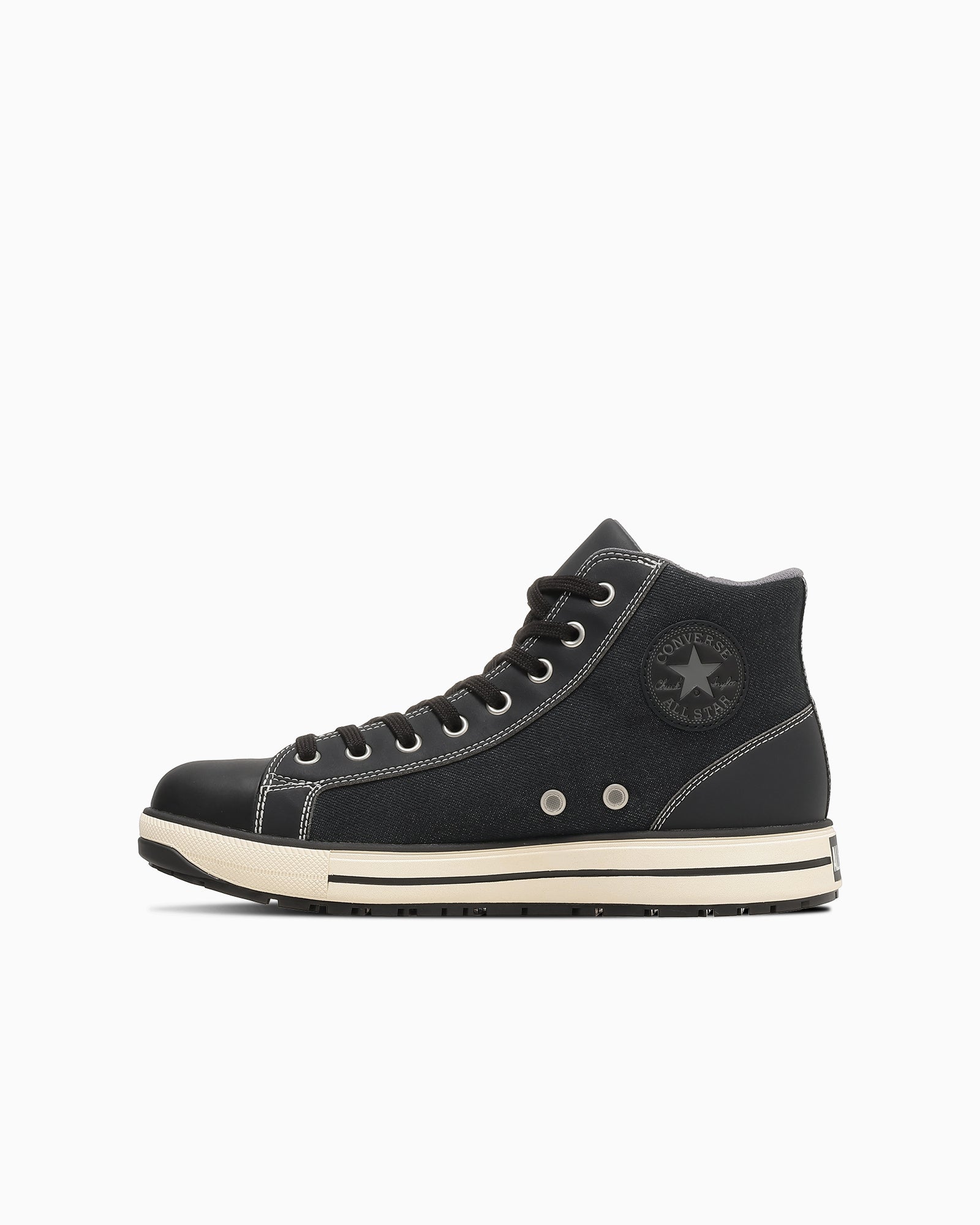 ALL STAR PS IIの素材・パターンアレンジモデル。外腰にジップを配したサイドジップ仕様を採用し、スムーズな着脱を可能にしています。アッパーにはワーク市場でも支持の高いデニム素材を使用し、ステッチカラーやアンクルパッチ、ステッチディテールによってデニム特有の表情を表現。
