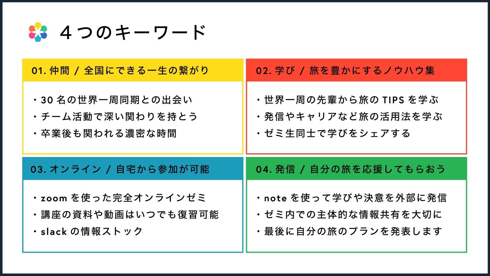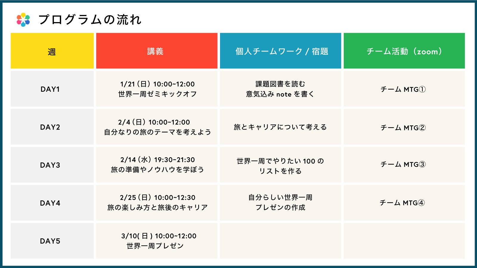 世界一周ゼミは全5回、50日間のプログラムです。参加者が様々な形の「世界一周」について考え、世界一周の準備を確認し、旅に出る前の不安を整理し、旅の面白さ、旅とキャリアについて考えていきます。ざっくり言えば「旅について・人生について真剣に楽しく考える場」です。直近で世界一周に行こうと思っている人、学生から社会人まで色んな人が集まる濃いコミュニティ(面白いコミュニティ)です。
