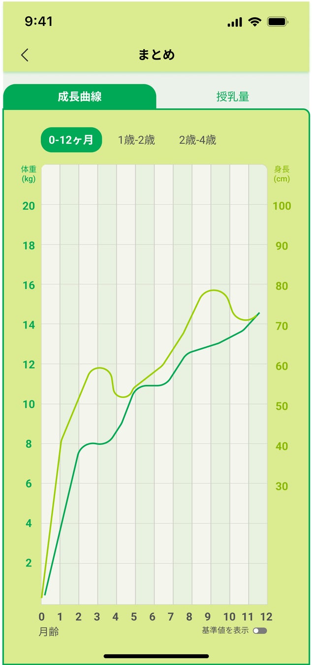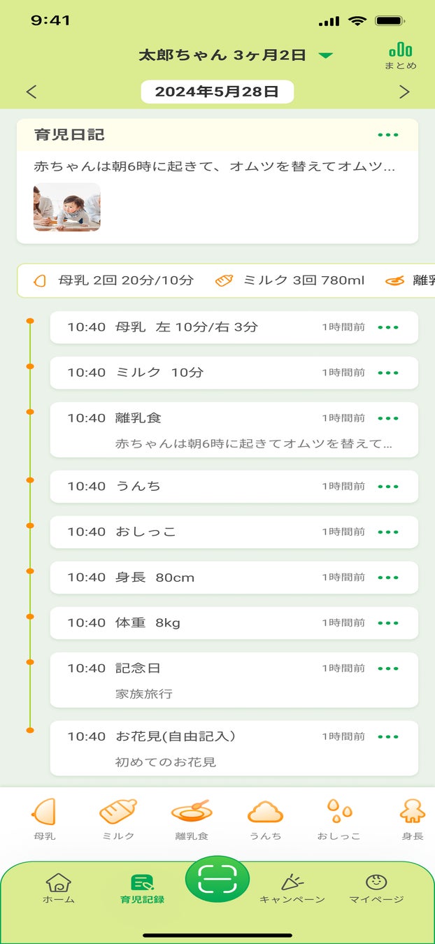 毎日の母乳やミルク量、おむつ交換に加えて、毎月の身長・体重を記録。日々の様子を写真とコメントで記録できます。カレンダー機能で、記念日を記録、予防接種の目安時期時期までわかります。