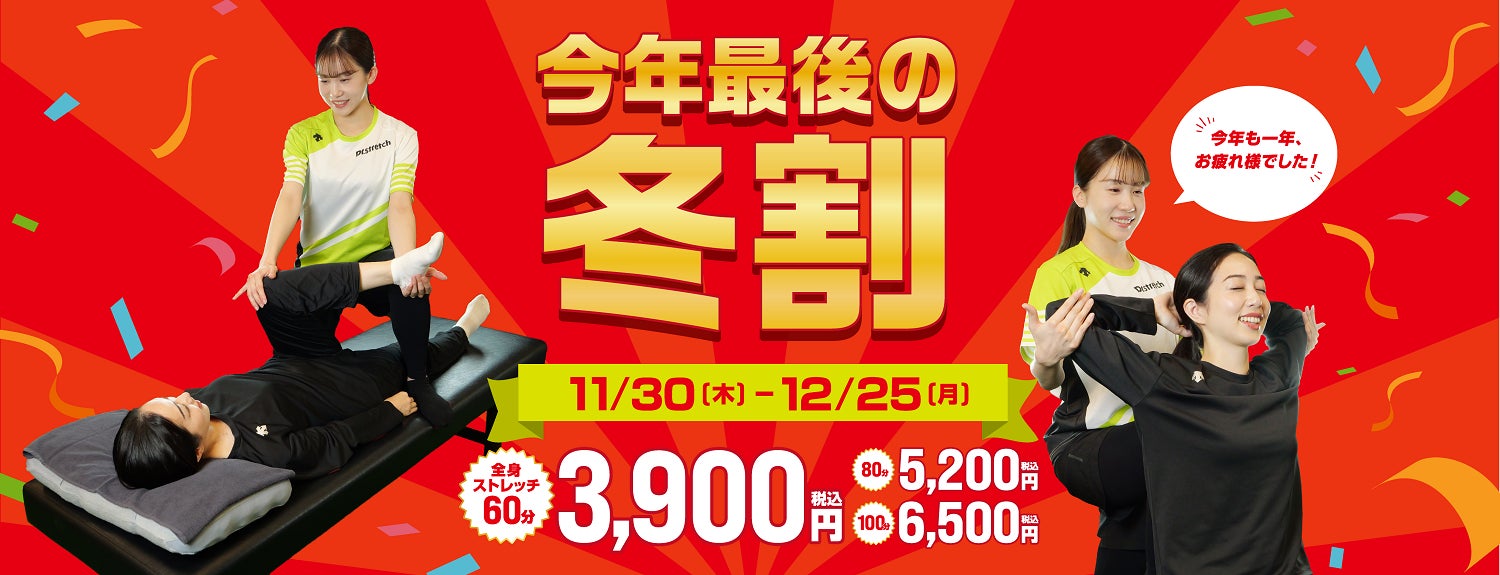 1年の溜まった負担をストレッチを受ける事でスッキリ解消いただける様、Dr.stretchでは今年最後の冬割キャンペーンを実施致します。この機会に是非ご体験下さいませ。