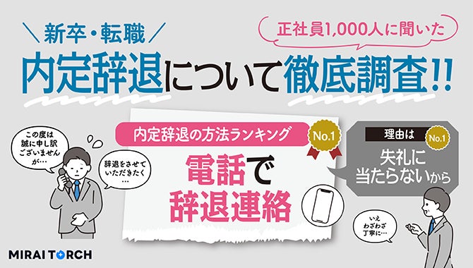 株式会社キュービック(本社:東京都新宿区、代表取締役:世一英仁)は、内定辞退の「方法」や「その理由」などについて正社員1,000人に調査し、転職活動や新しいキャリアの選択を支援するサービス『ミライトーチ』にて公開しました。