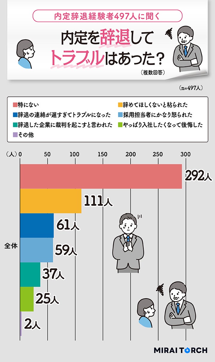 「内定を辞退してトラブルはあったか」については、圧倒的多数で「特にない」が1位、2位が「辞めてほしくないと粘られた」、3位は「辞退の連絡が遅すぎてトラブルになった」というランキング結果となりました。