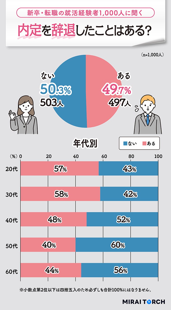 このたび『ミライトーチ』では、20代から60代の正社員1,000人を対象に、「内定辞退の方法」や「内定辞退方法を選んだ理由」、「トラブルはあったか」などについて調査を実施し、年代ごとに回答を分析しました。