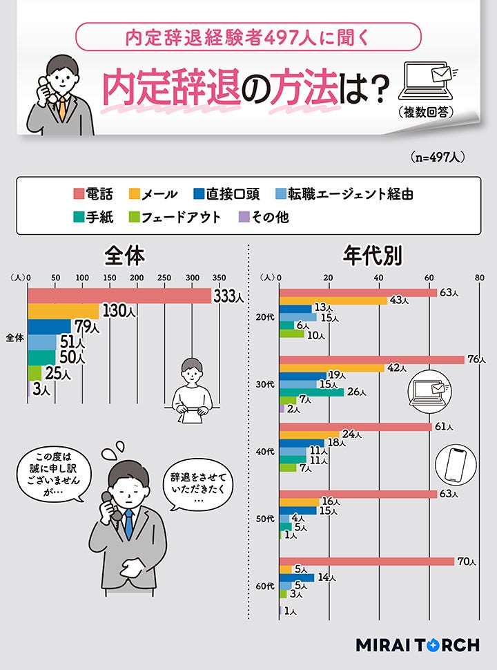 「内定辞退の方法は電話が一番多い【正社員1,000人調査】内定辞退の理由や辞退した企業数について年代別に比較」