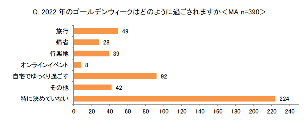 その一方で、「2022年のゴールデンウィークはどのように過ごされますか<MA>」では、「特に決めていない」(224)が約半数近くと最も多くなりました。2021年同様、自宅でゆっくり過ごすという回答も2割近くいる一方で、新型コロナウイルスの感染状況次第で行動範囲も変わるため、未だ予断を許さない状況下においては、予定を決めかねている家庭が多いことが分かります。