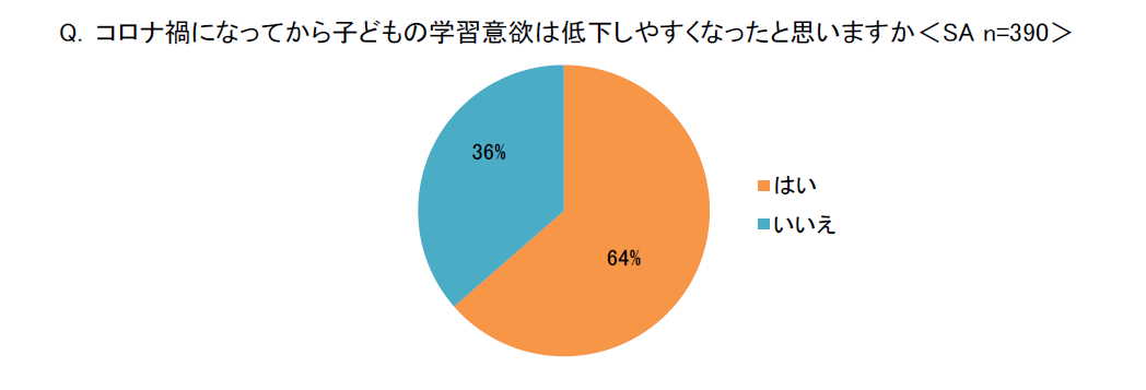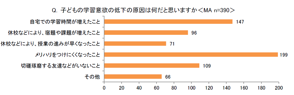 「コロナ禍になってから子どもの学習意欲は低下しやすくなったと思いますか<SA>」という問では、6割以上が「はい」(248)と回答しました。さらに、「子どもの学習意欲の低下の原因は何だと思いますか<MA>」で最も多い回答は、「メリハリをつけにくくなったこと」(199)となりました。相次ぐ休校やオンライン授業の導入により自宅で学習する機会が増え、オンオフの切り替えが難しい状況であることが分かります。また、「自宅での学習時間が増えたこと」(147)、「切磋琢磨する友達などがいないこと」(109)からも分かるように、子どもが自宅で自ら学習するための工夫が求められていることが伺えます。
